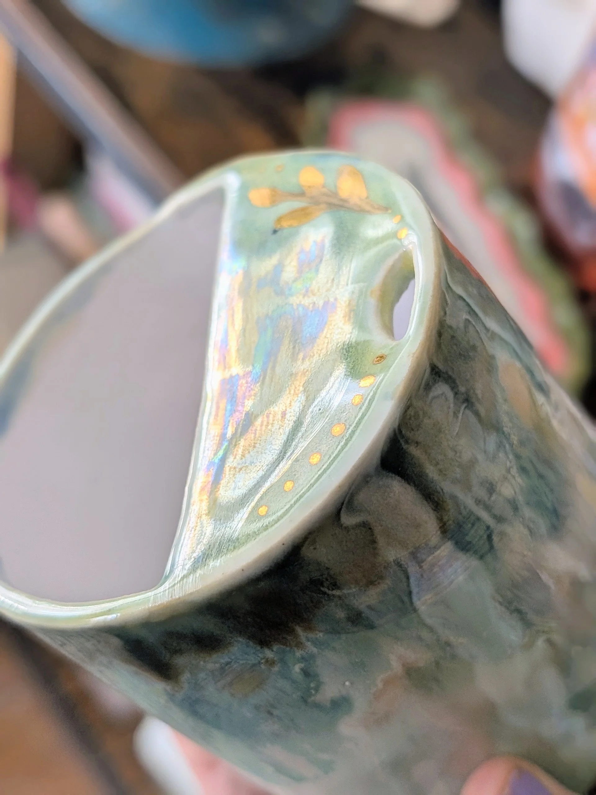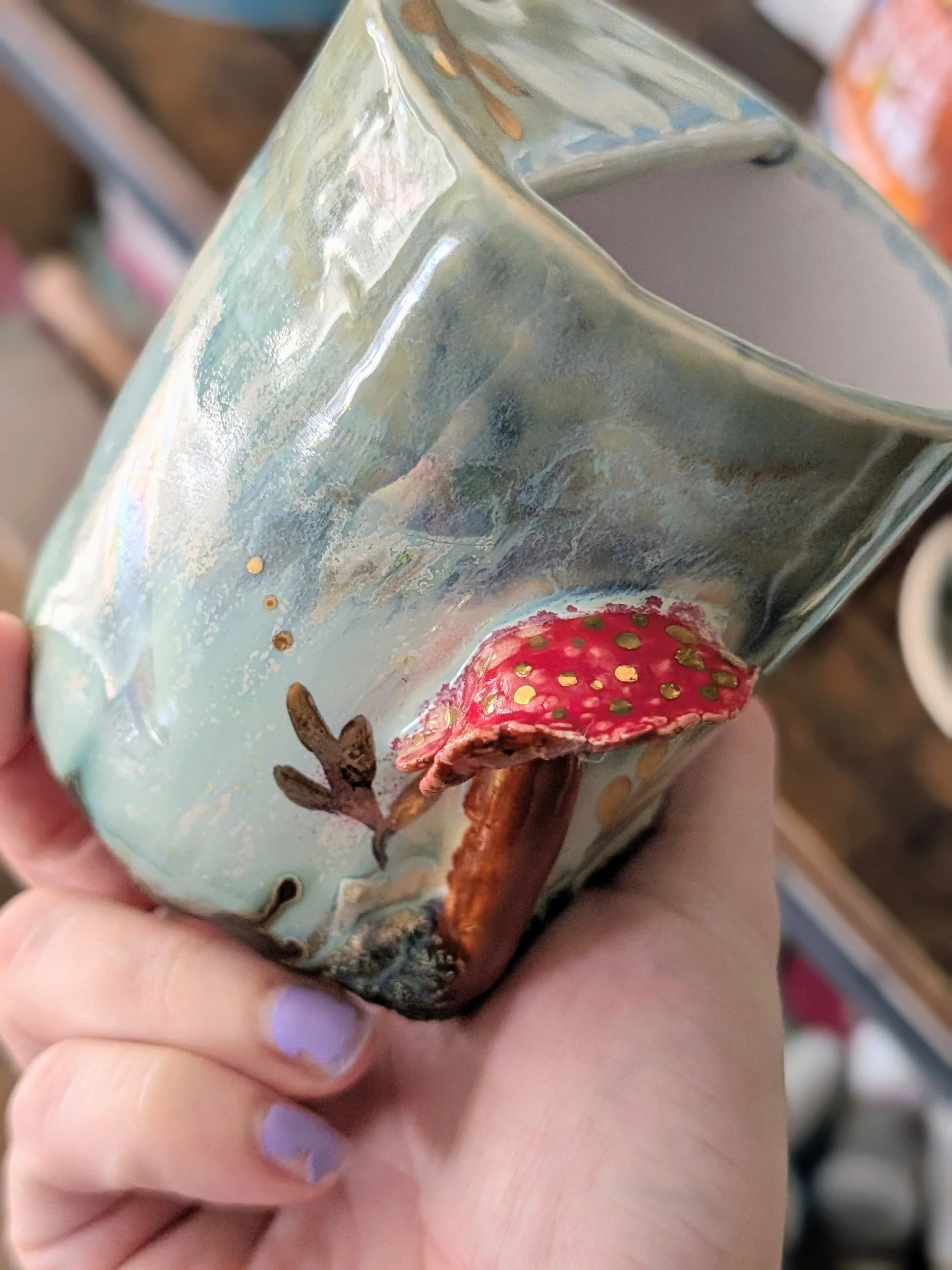 The body of the cup has been glazed in a soft pastel green. with sculpted fly agaric mushroom to the front.
