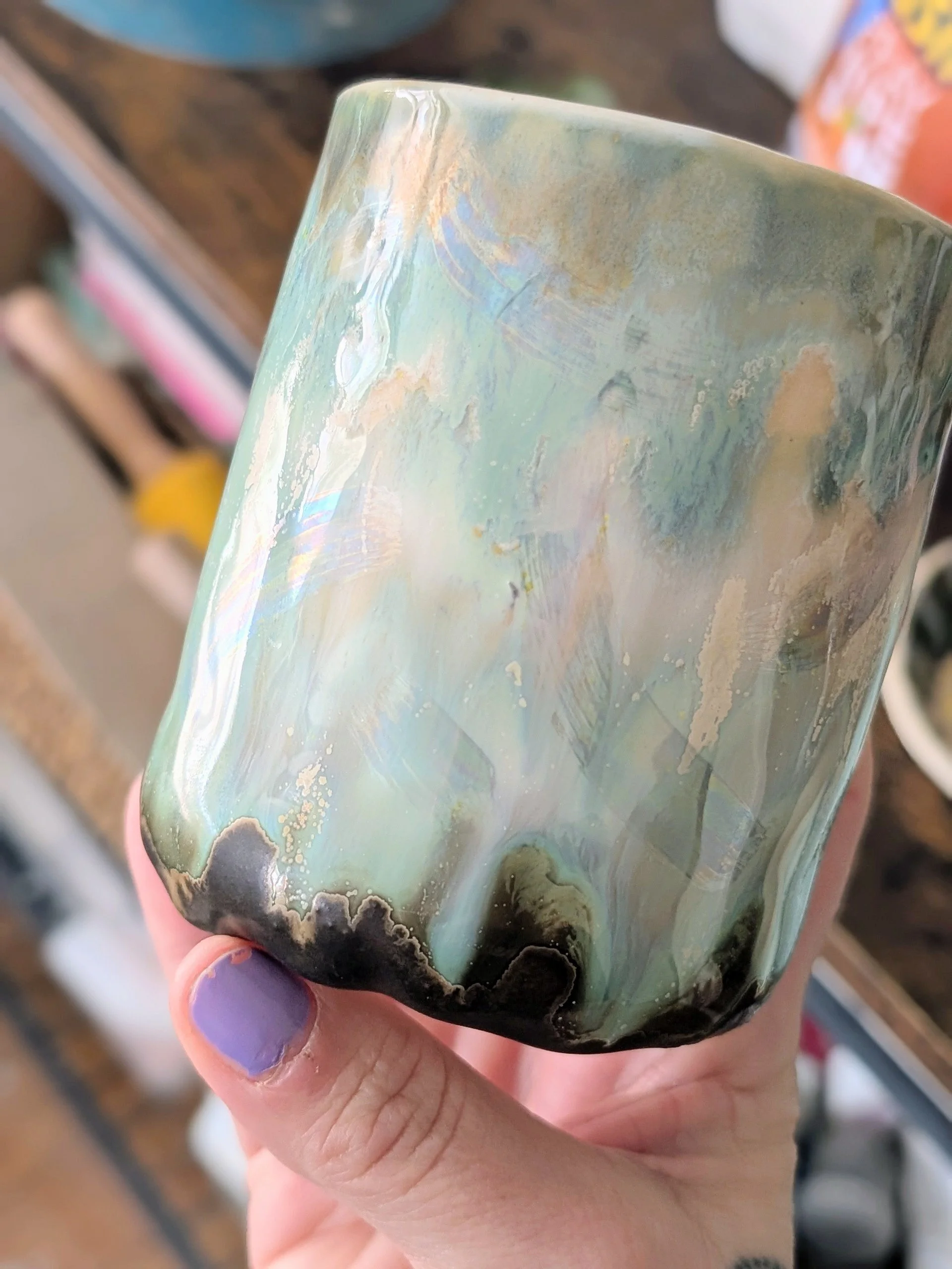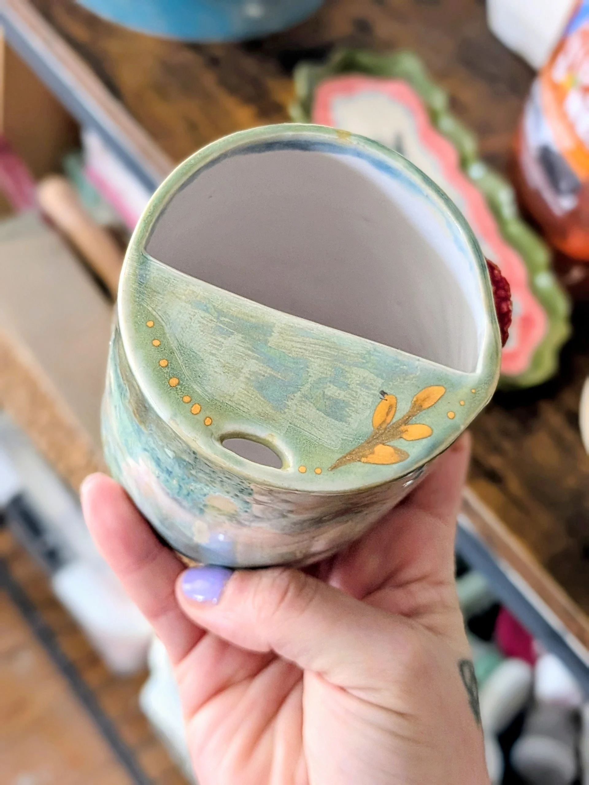This is a handmade handbuilt sippy cup, suitable for travel (but must be kept upright as they have a demi lid).