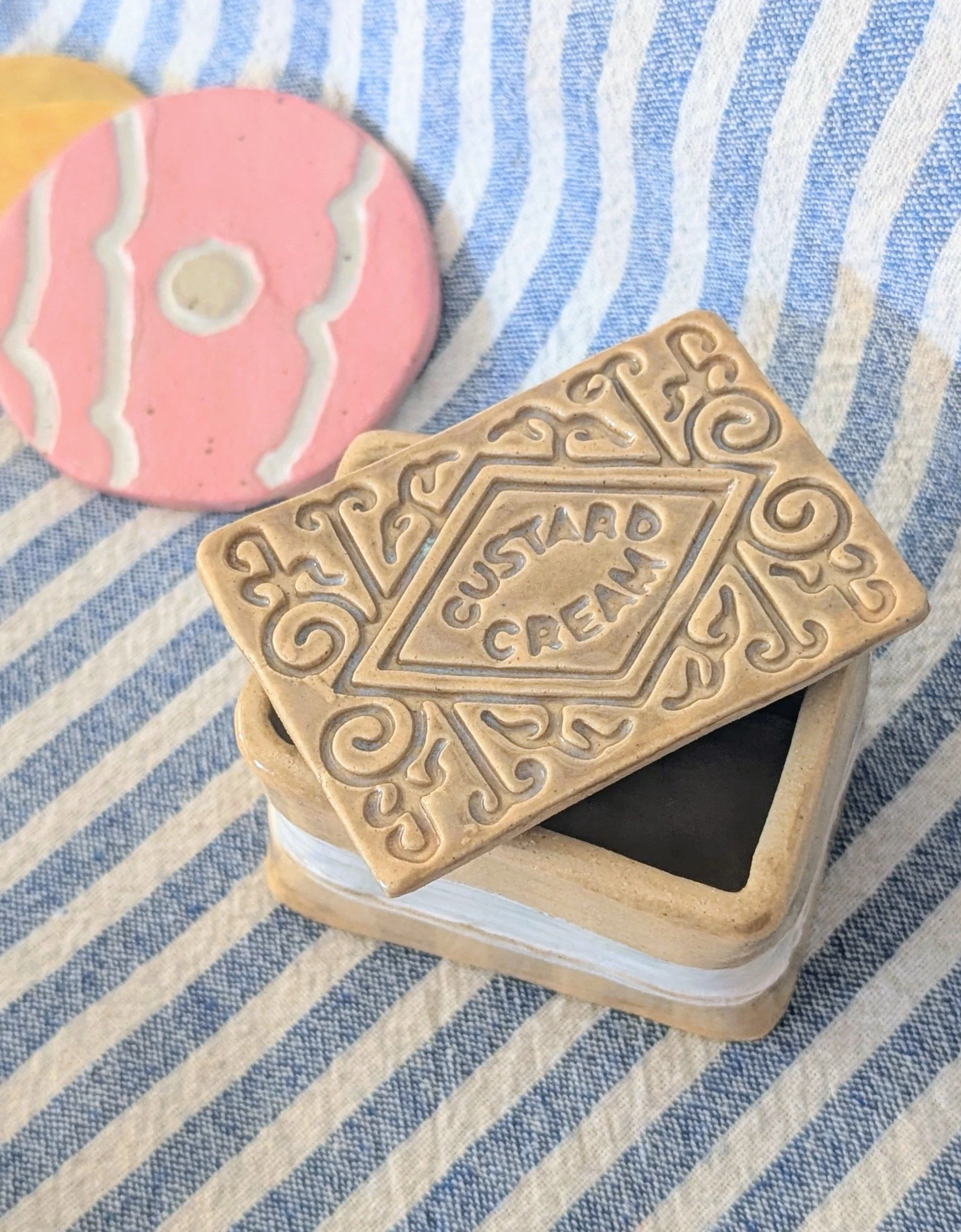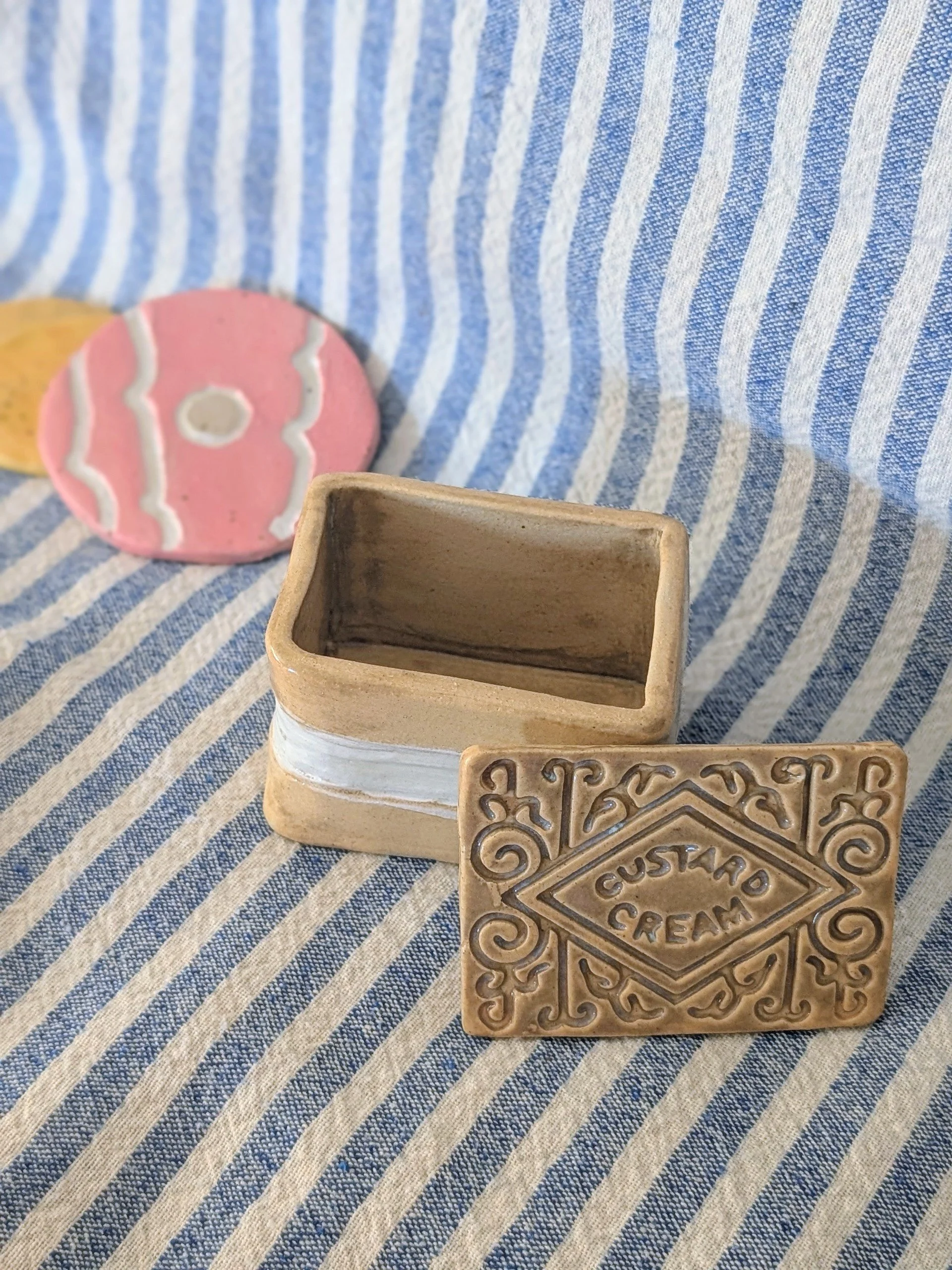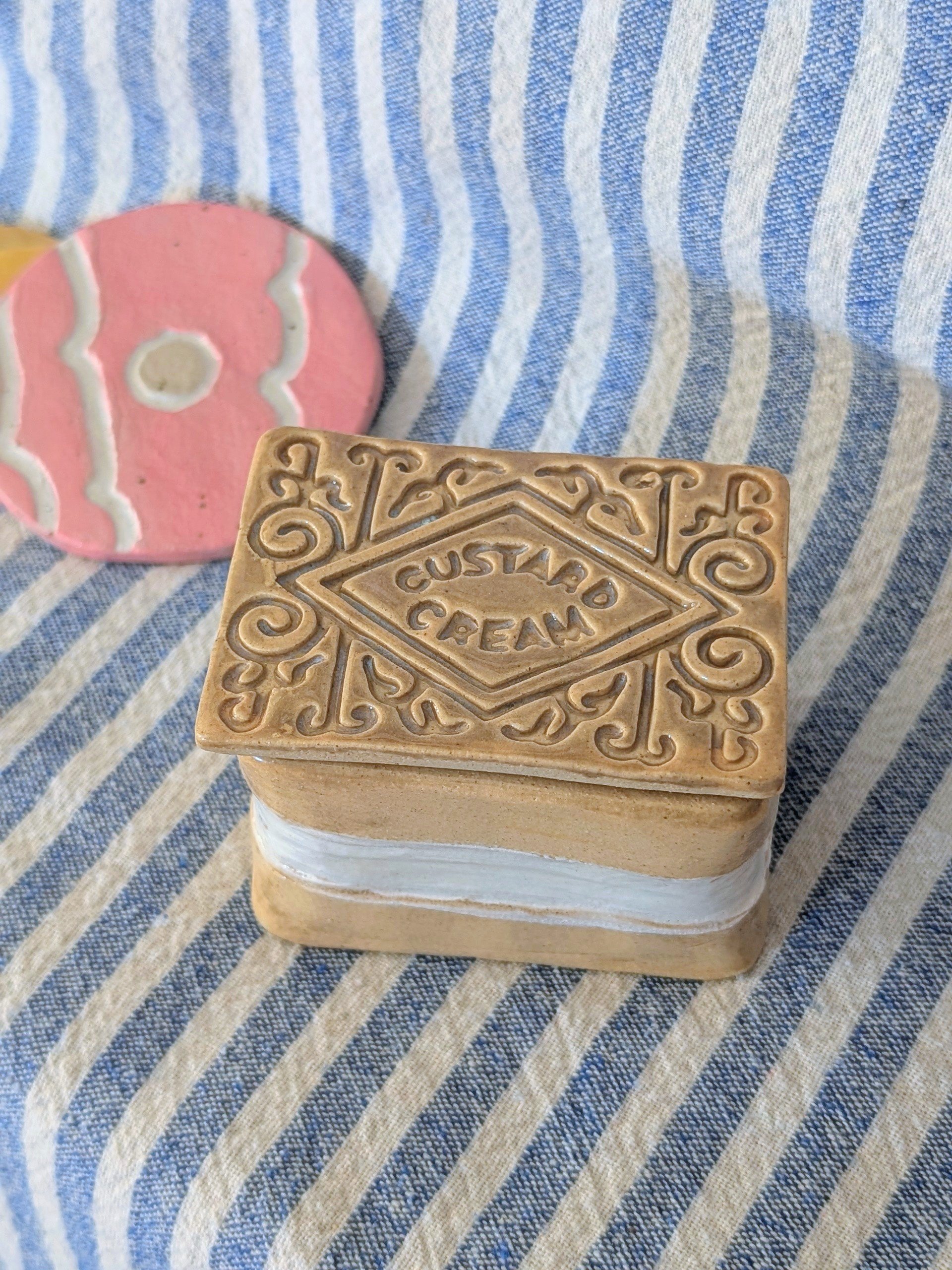 looking for somewhere to keep your secret sweets? This is a little hand built custard cream jar, it’s perfect for hiding secret biscuits or sweets, lose change or trinkets. It has been hand built and glazed to replicate the biscuit design.