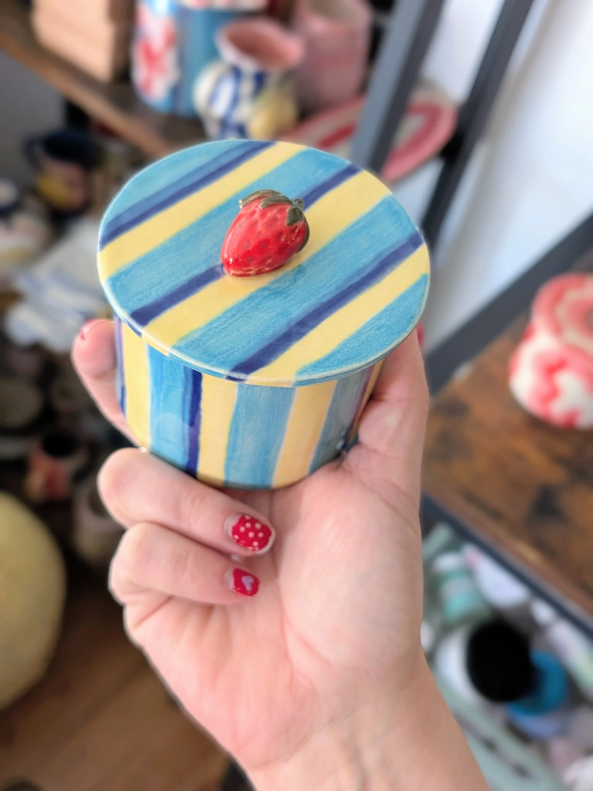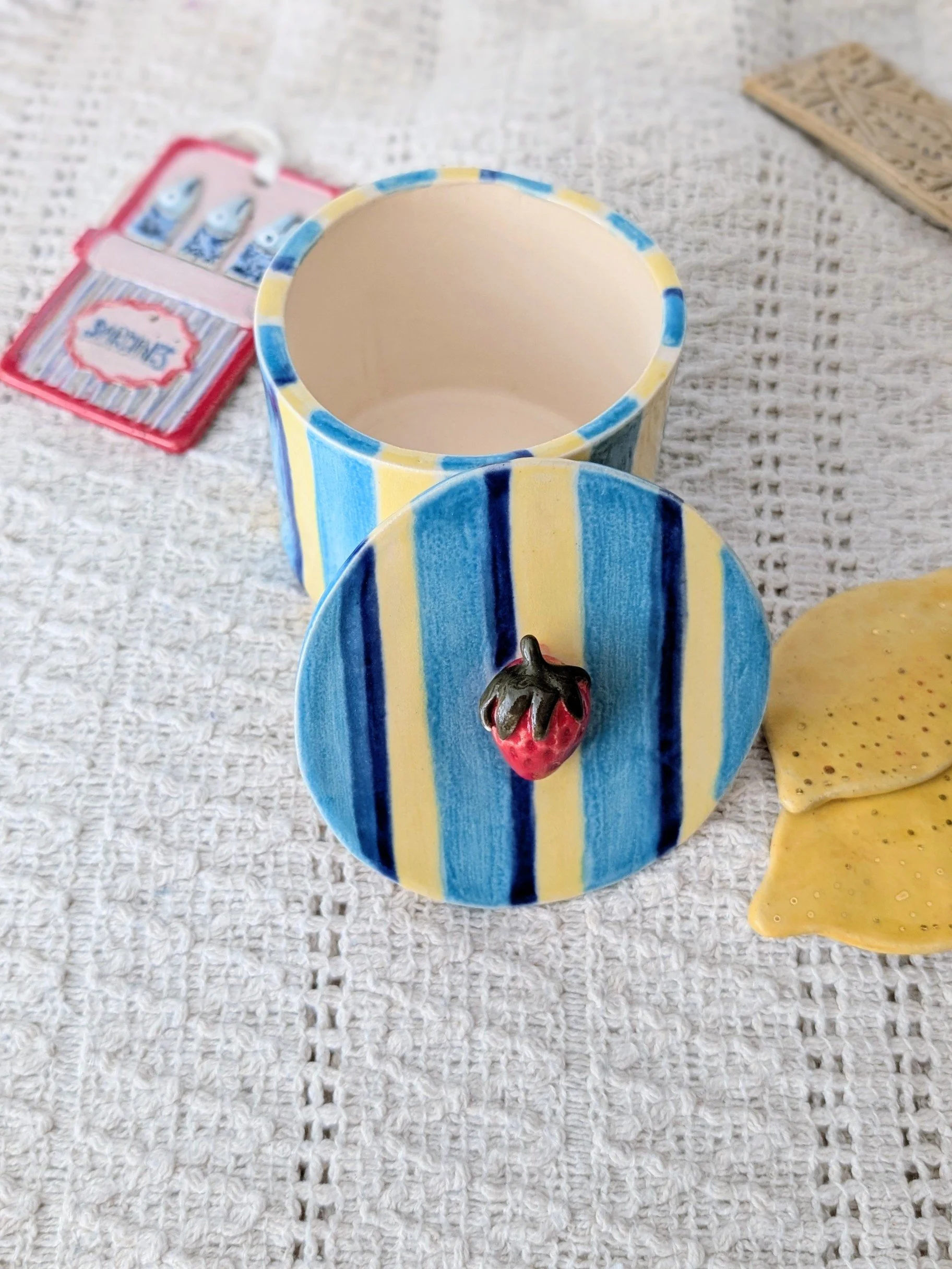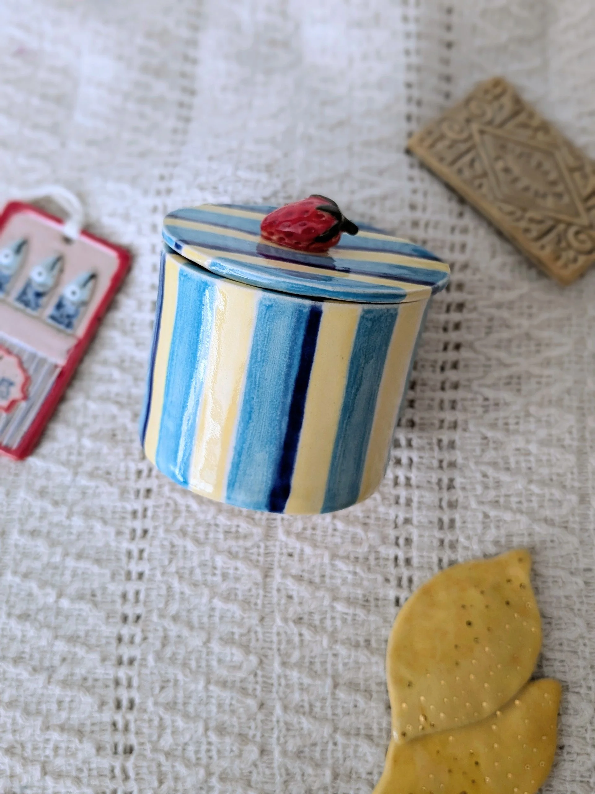 Handmade in my studio, each piece has its own unique character. Finished with a playful blue stripe design, it brings a soft pop of colour and a touch of whimsy to any space.