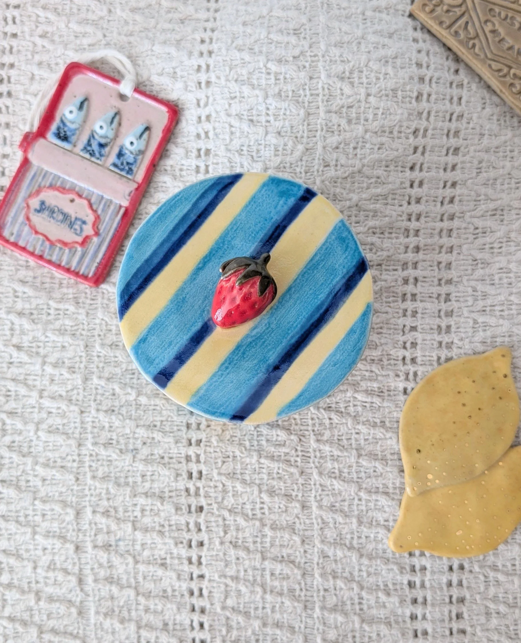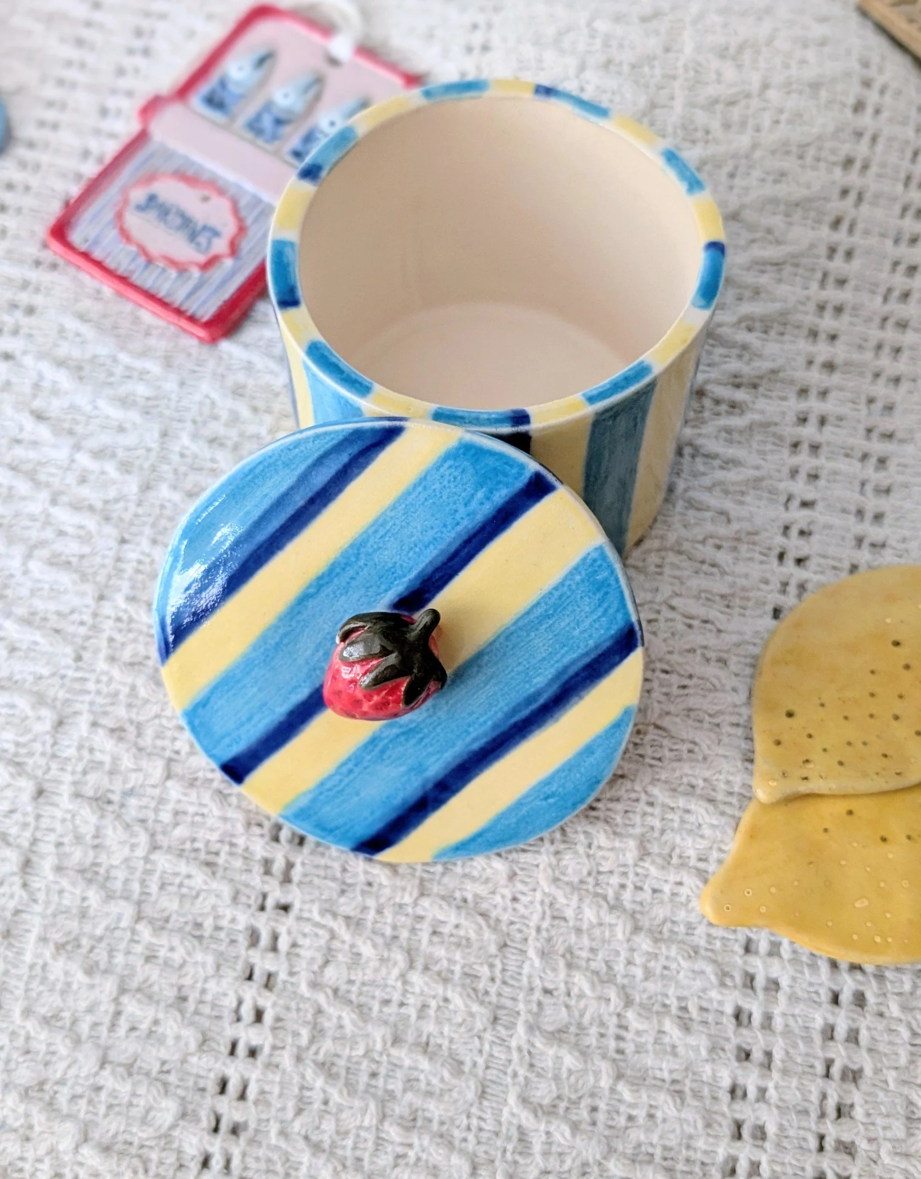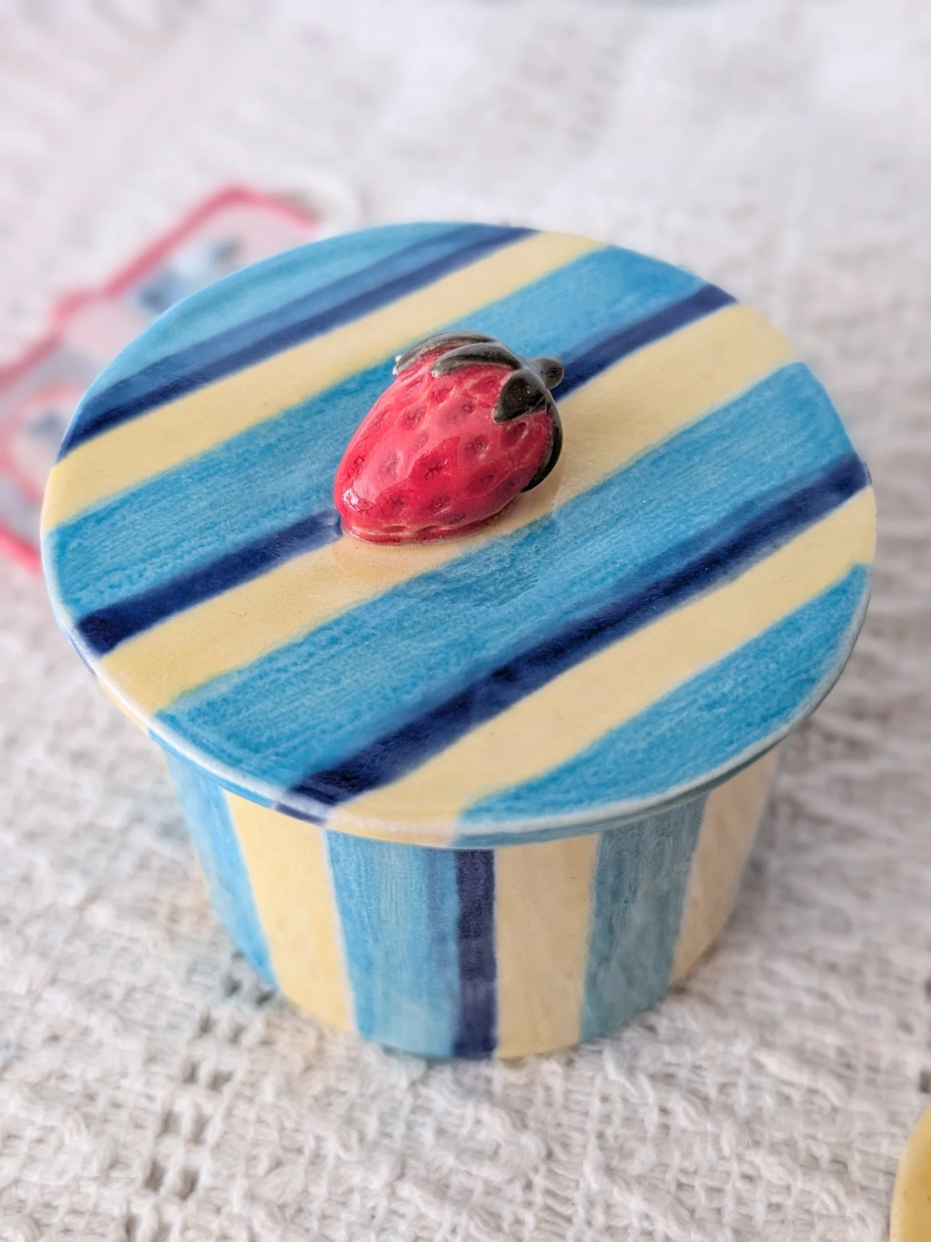 Handmade in my studio, each piece has its own unique character. Finished with a playful blue stripe design, it brings a soft pop of colour and a touch of whimsy to any space.