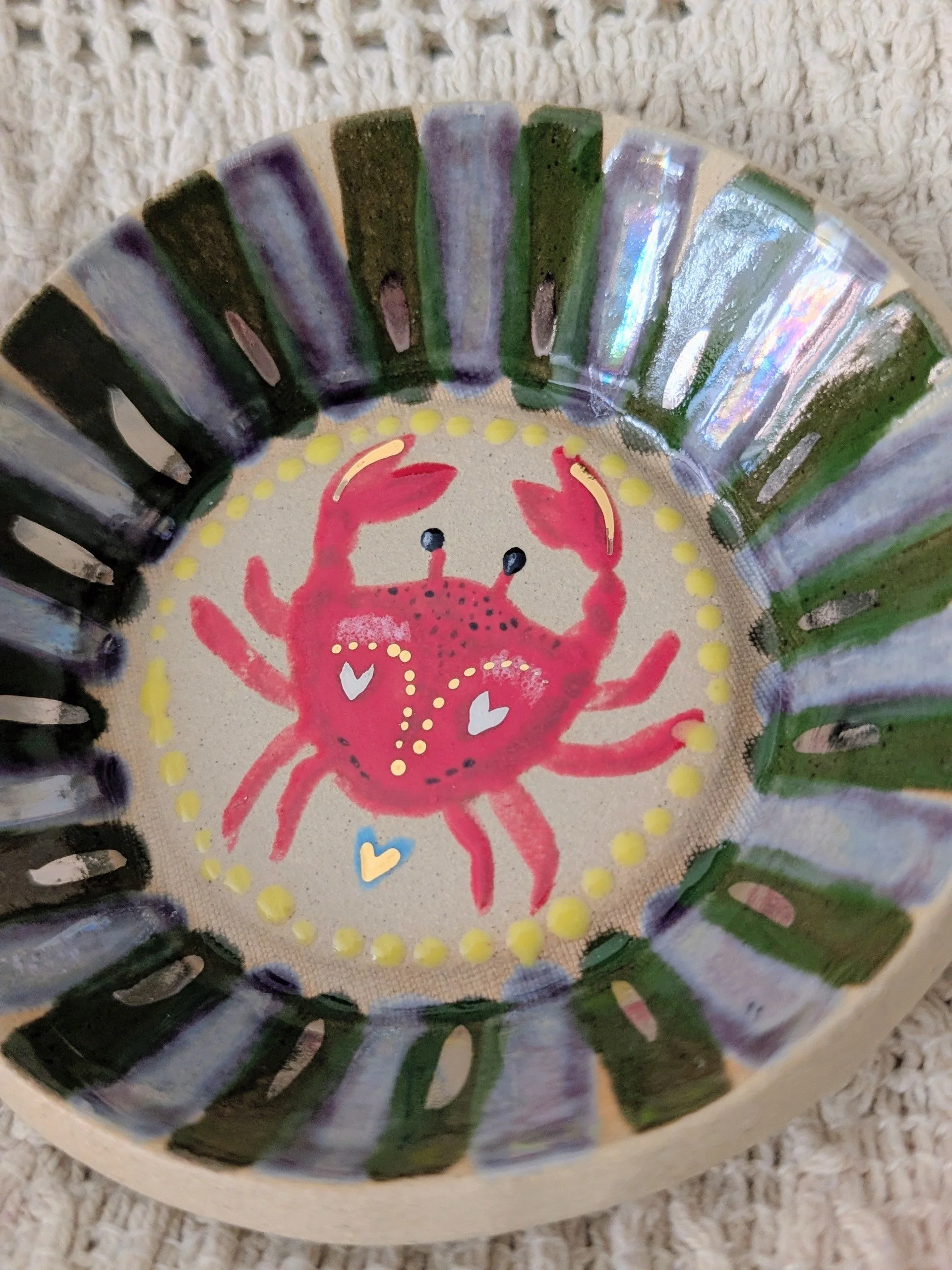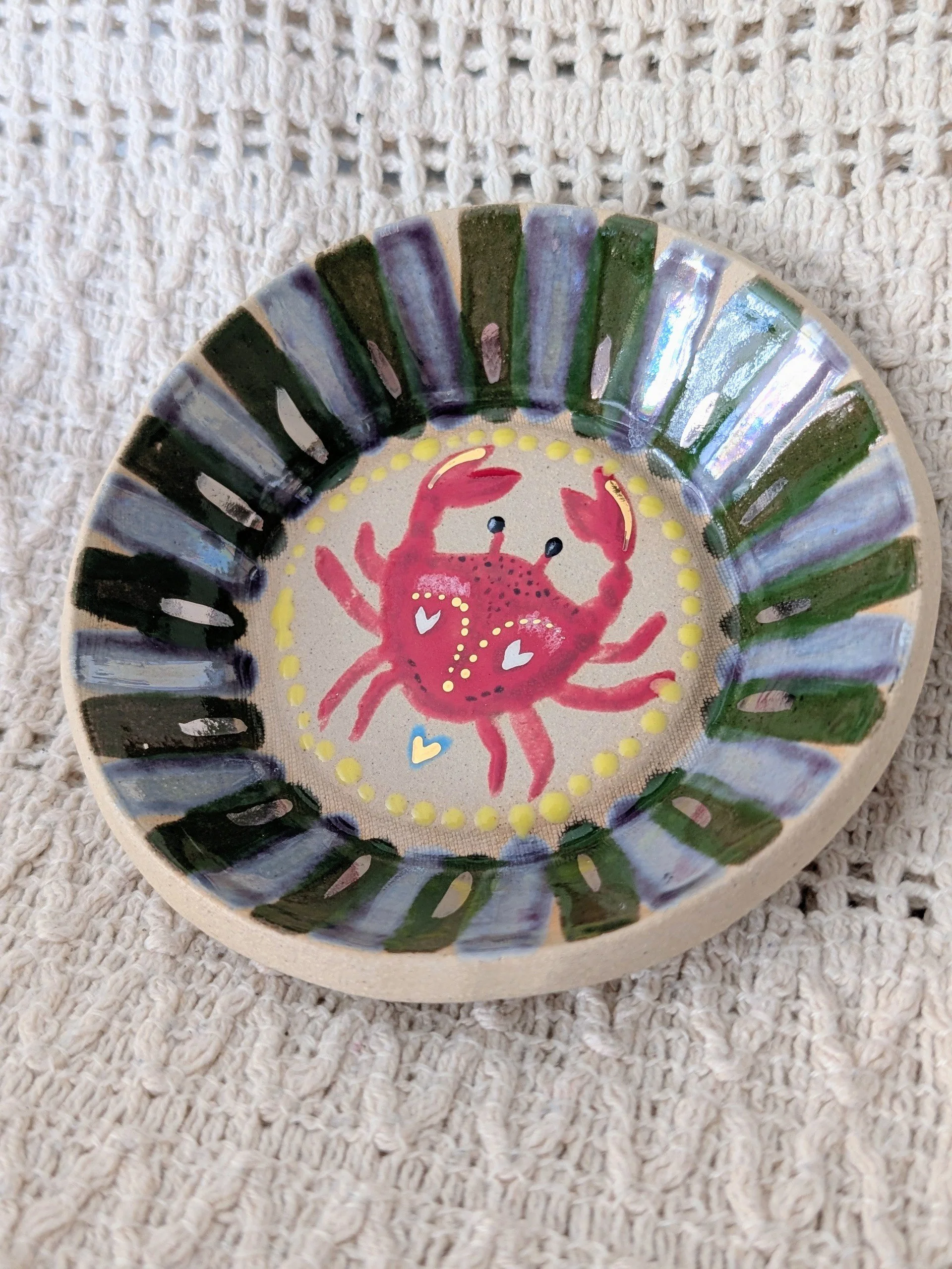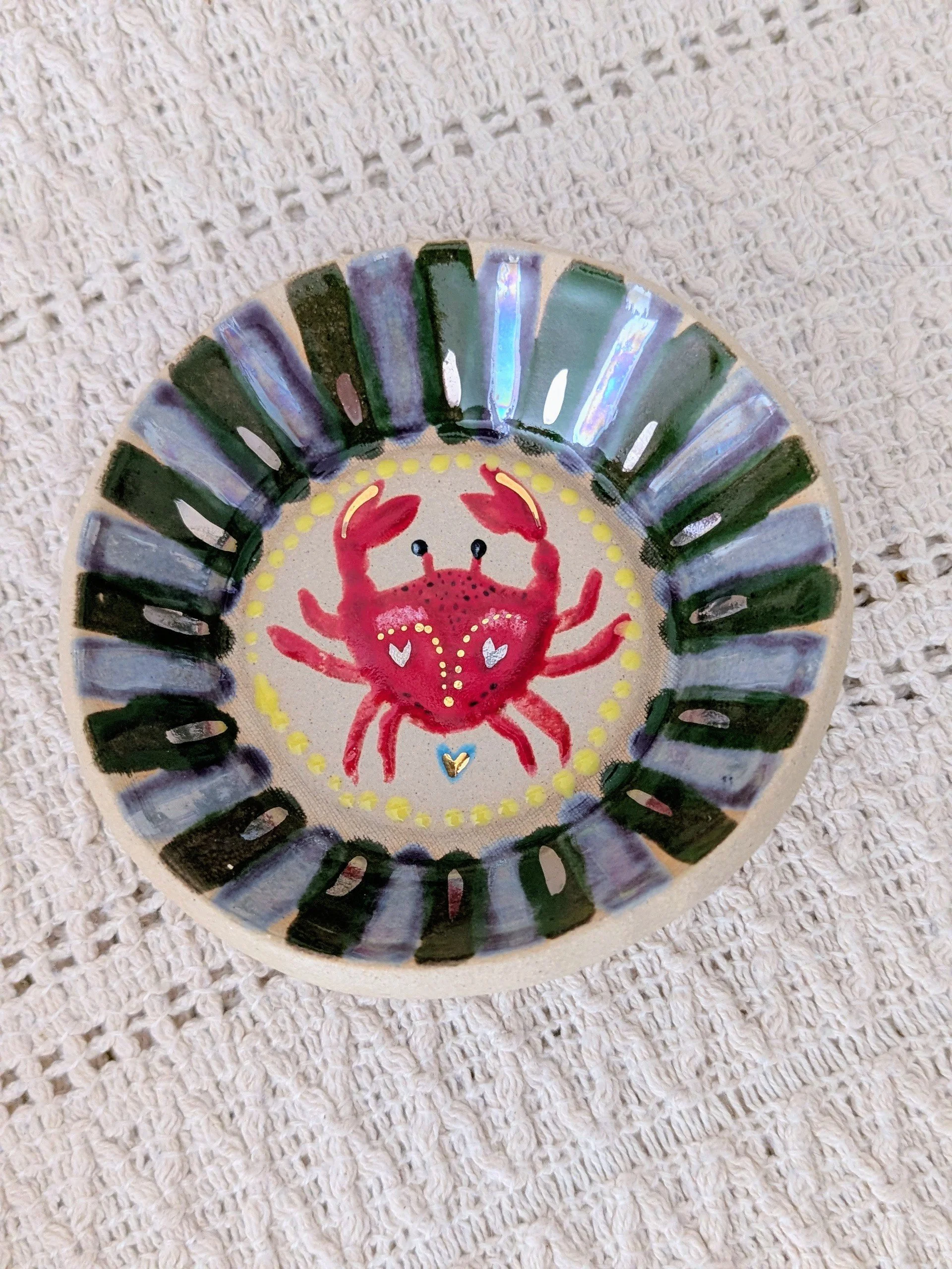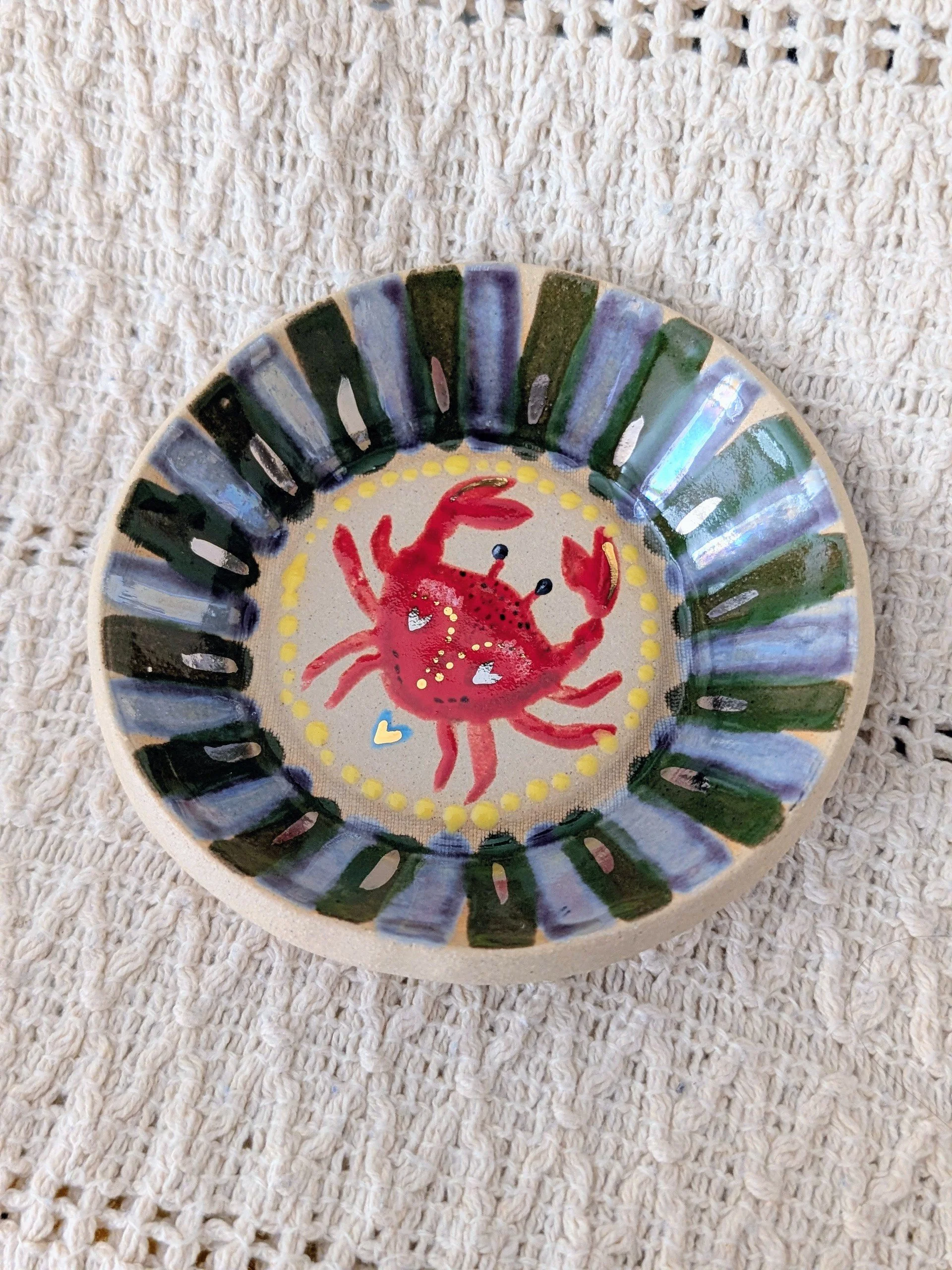 This is a super cute, hand-built dish crafted from flecked stoneware clay and shaped in a unique, organic form. It has been carefully hand painted with a charming crab design.