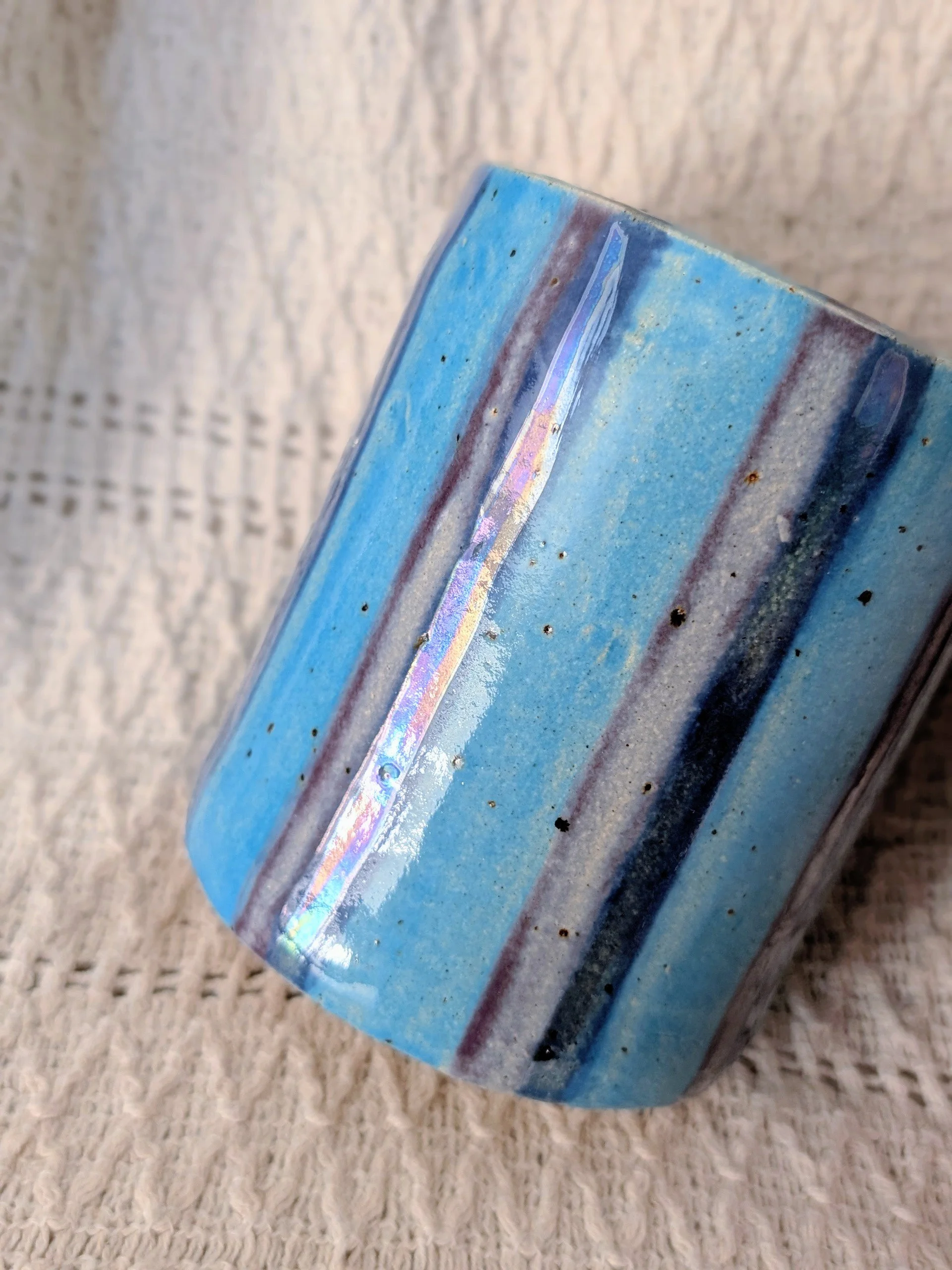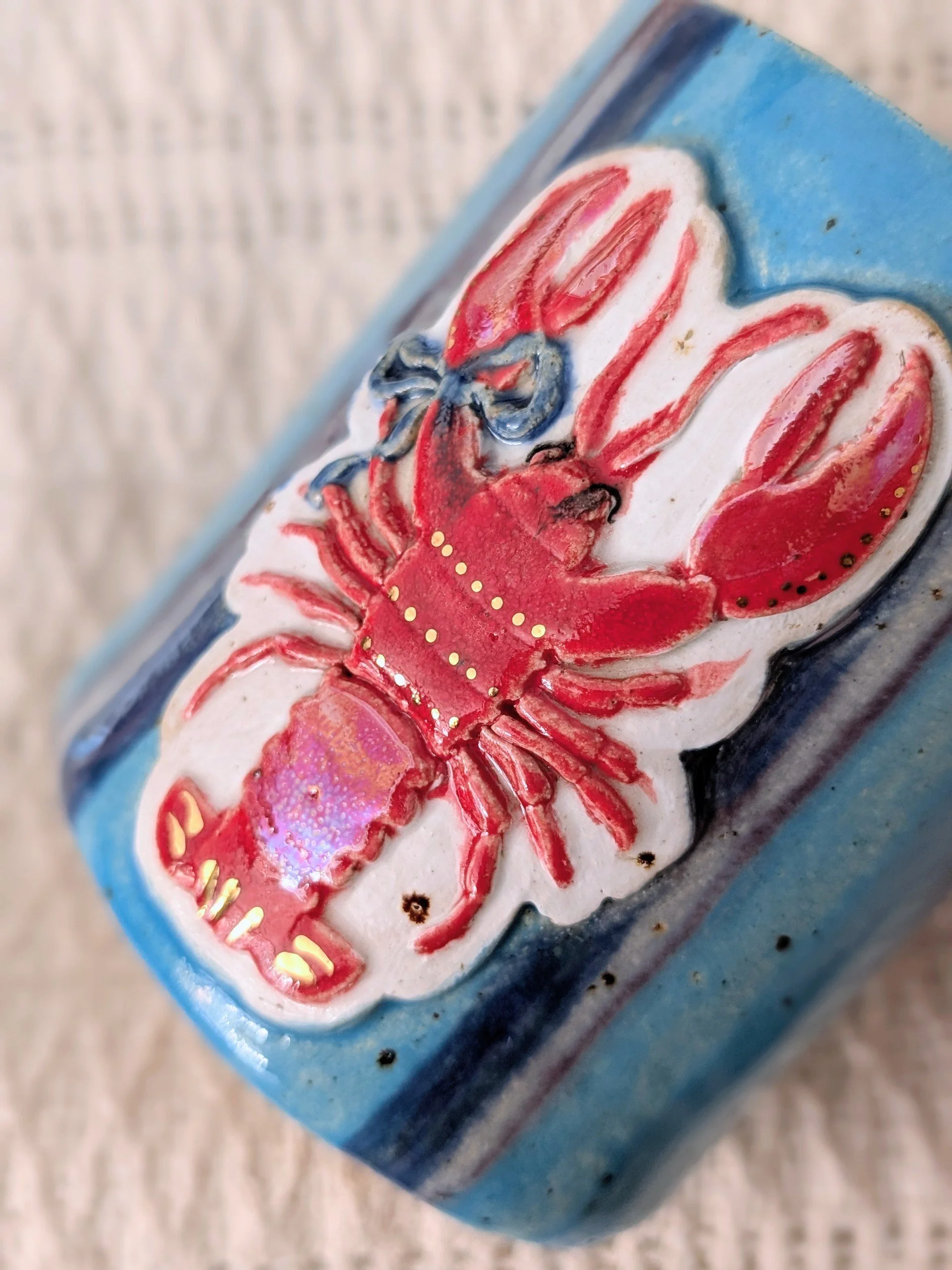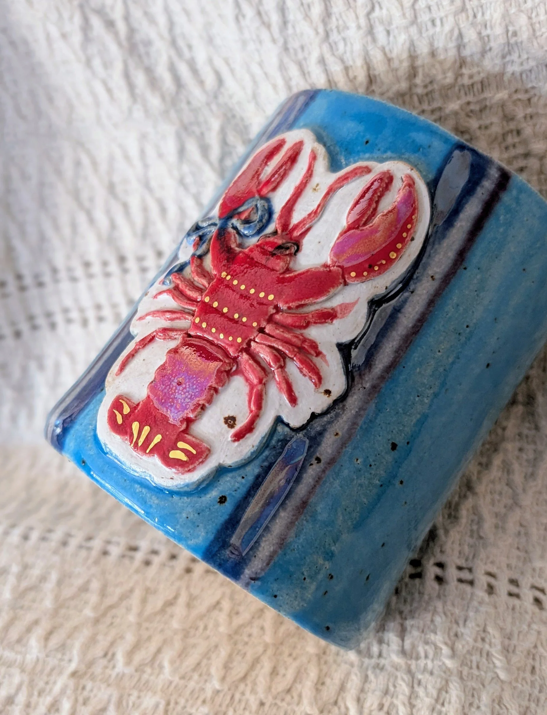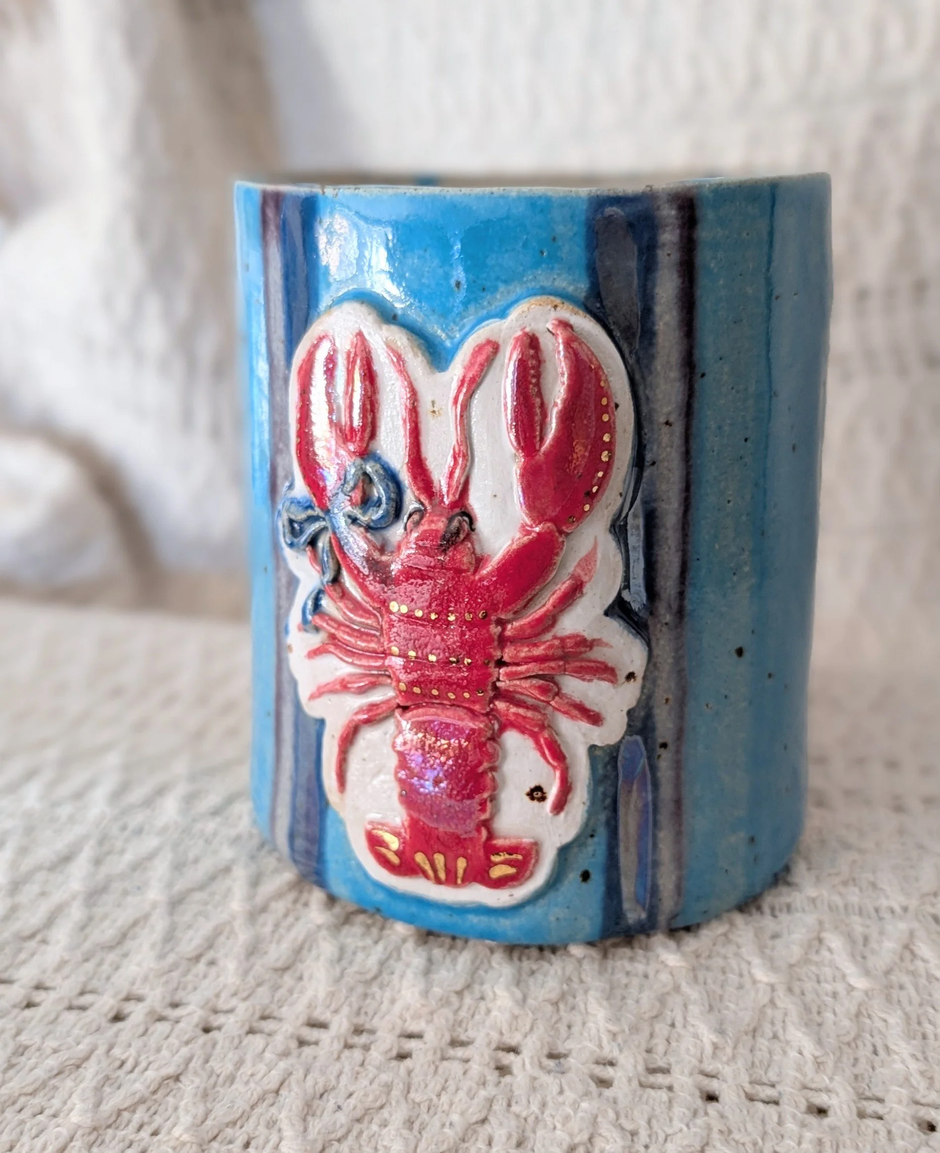 This is a hand built stoneware planter, made from a flecked clay. It has a hand cut lobster to the front, that has been hand glazed, The body of the planter has hand painted blue stripes.