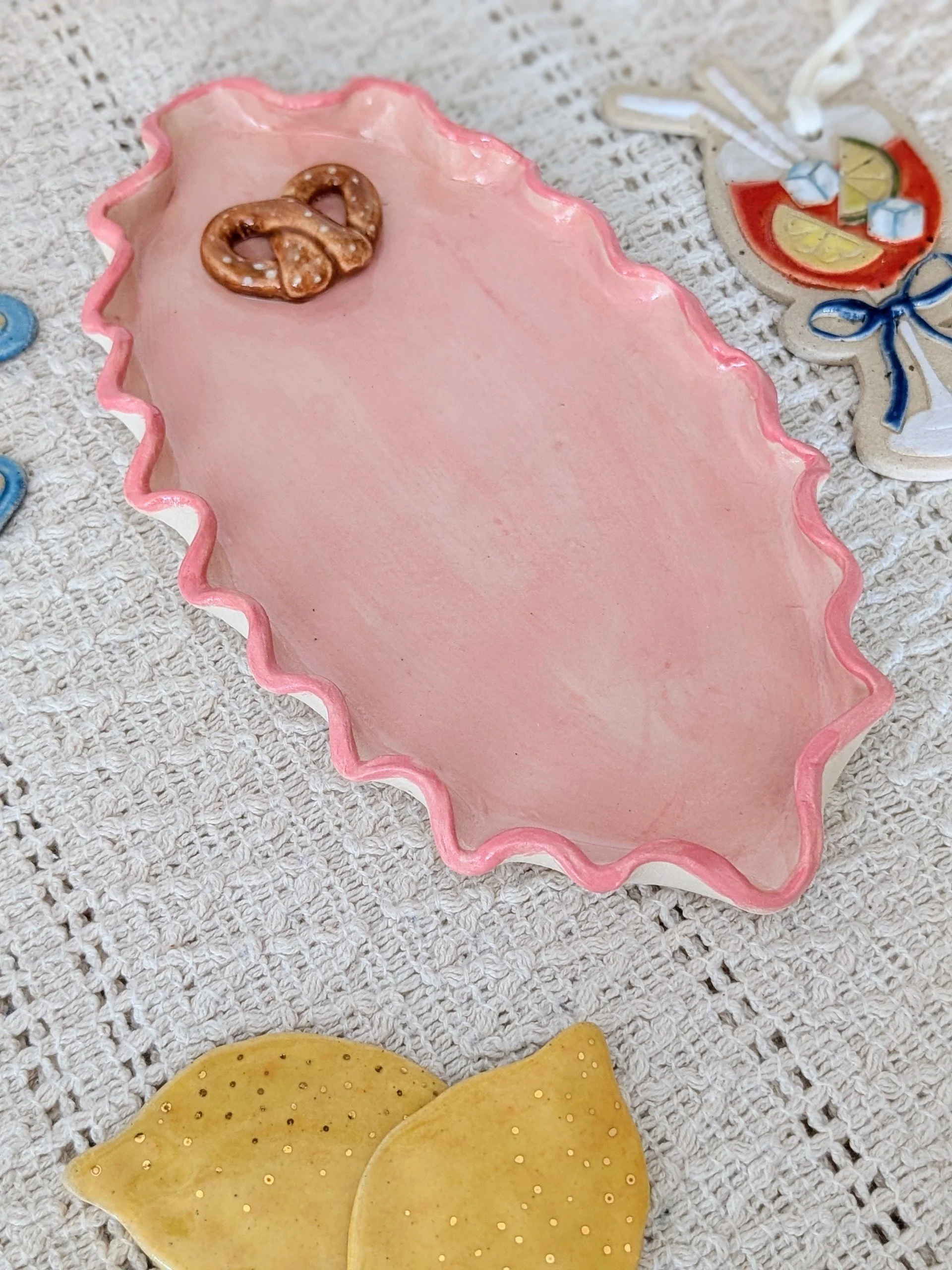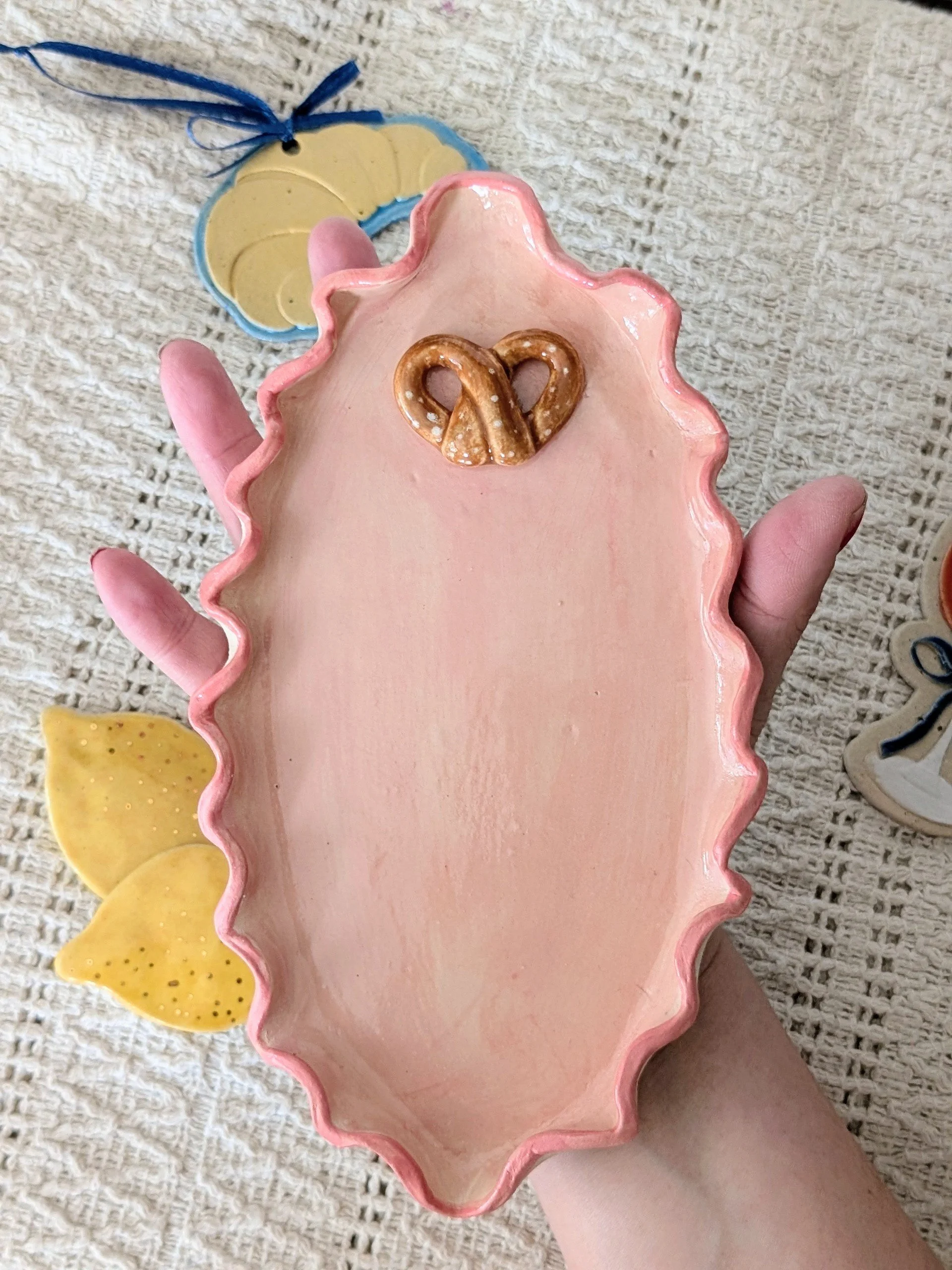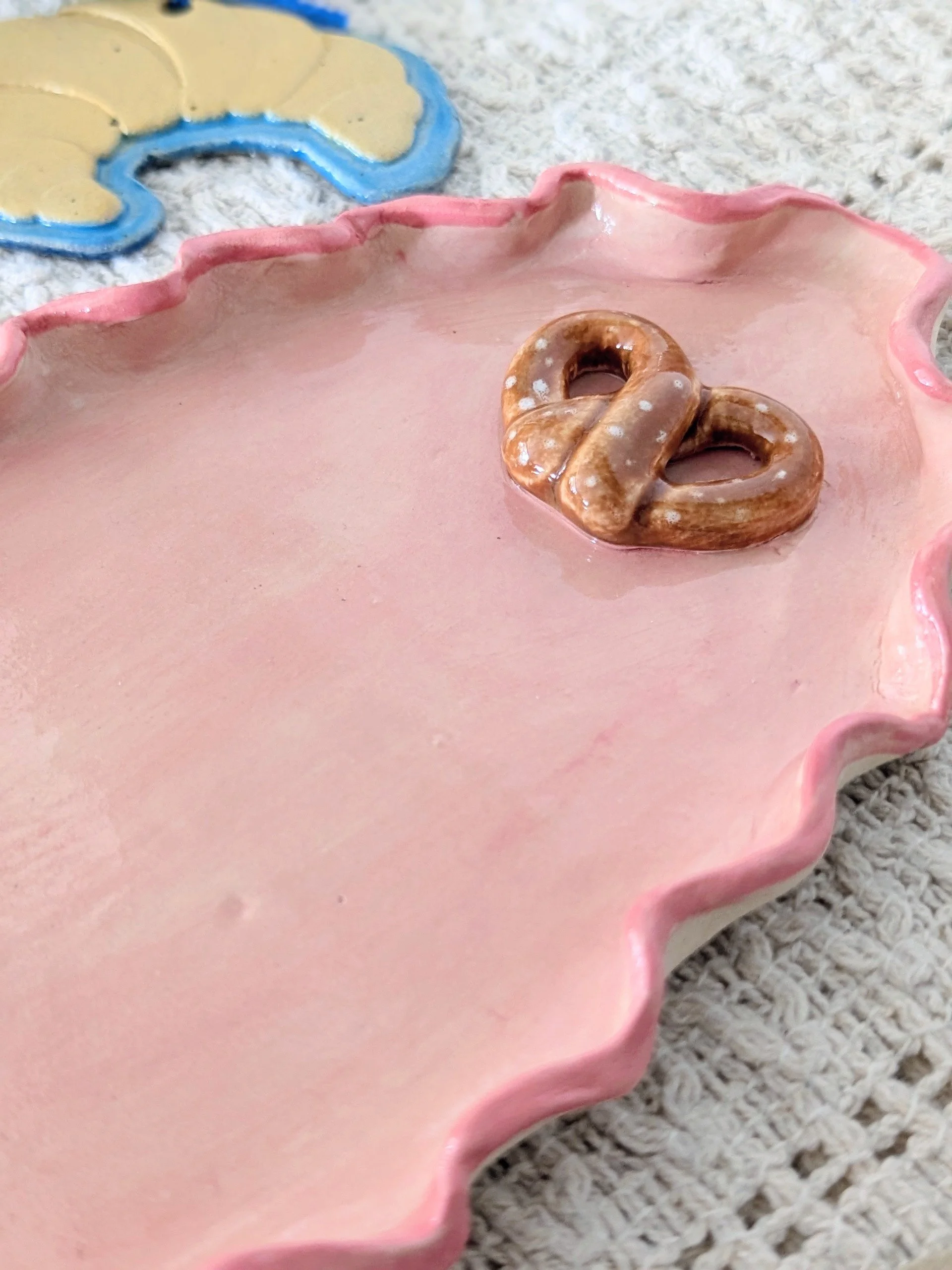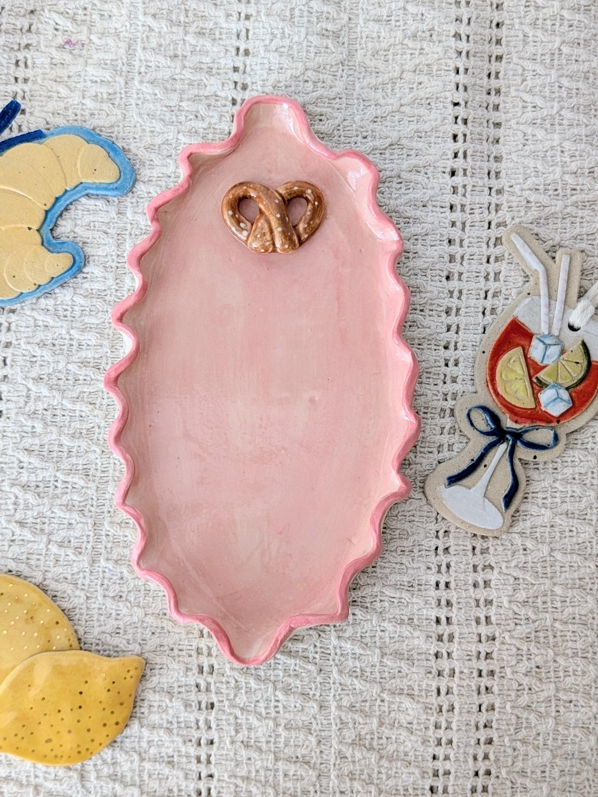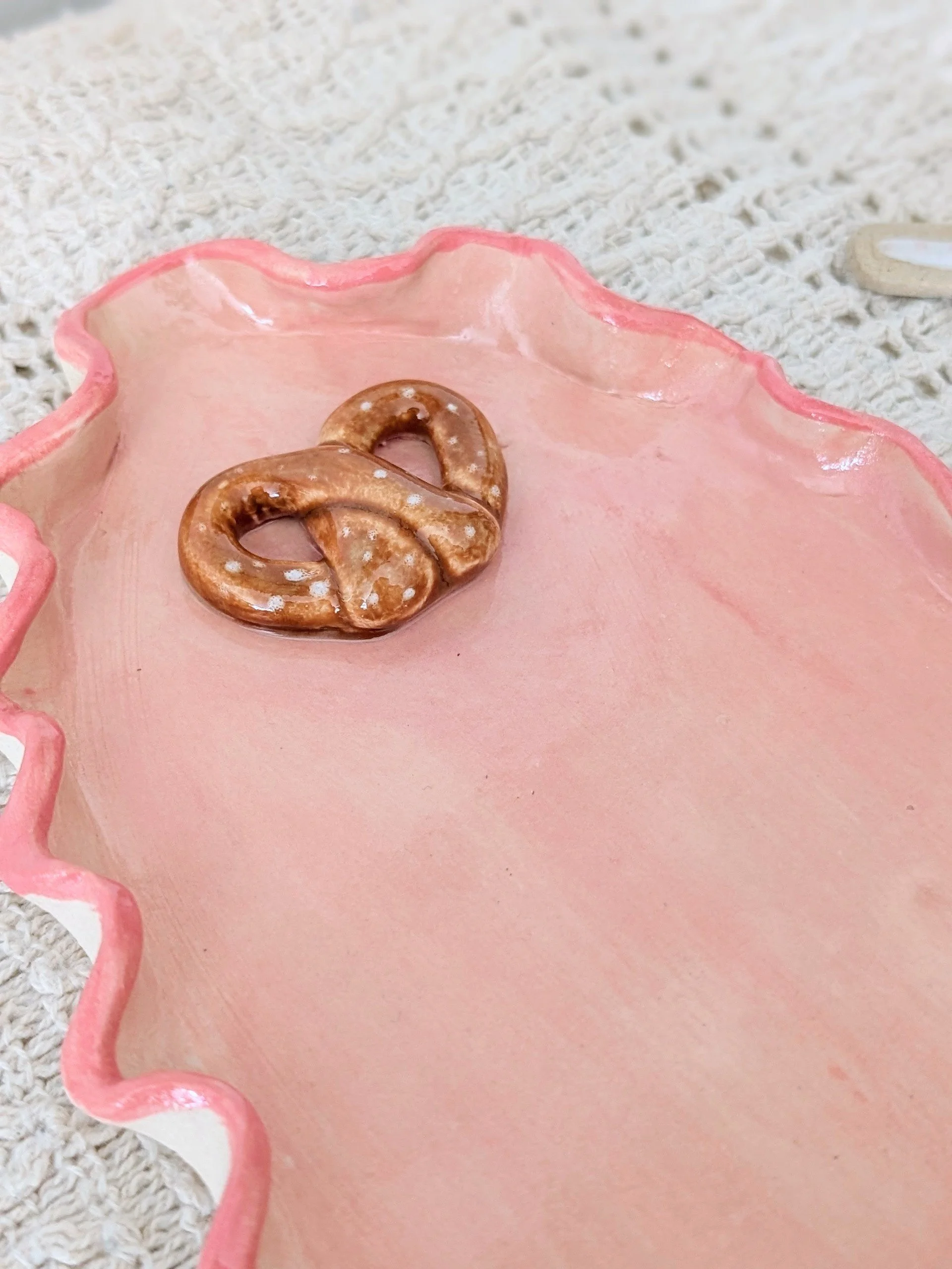 A handcrafted ceramic trinket dish in a soft blush pink, featuring delicately ruffled edges and a glossy glaze finish. Nestled inside is a tiny sculpted pretzel detail.