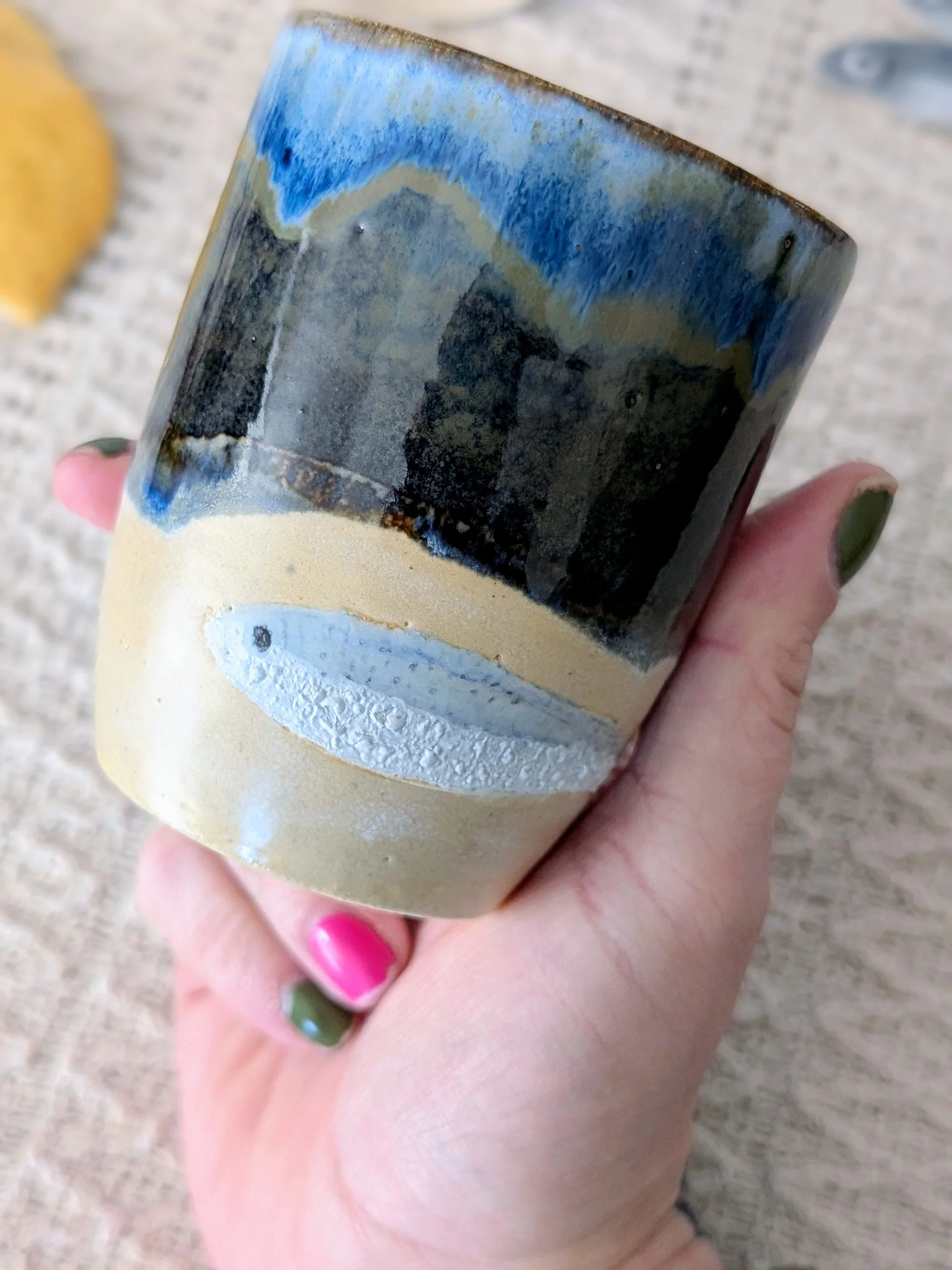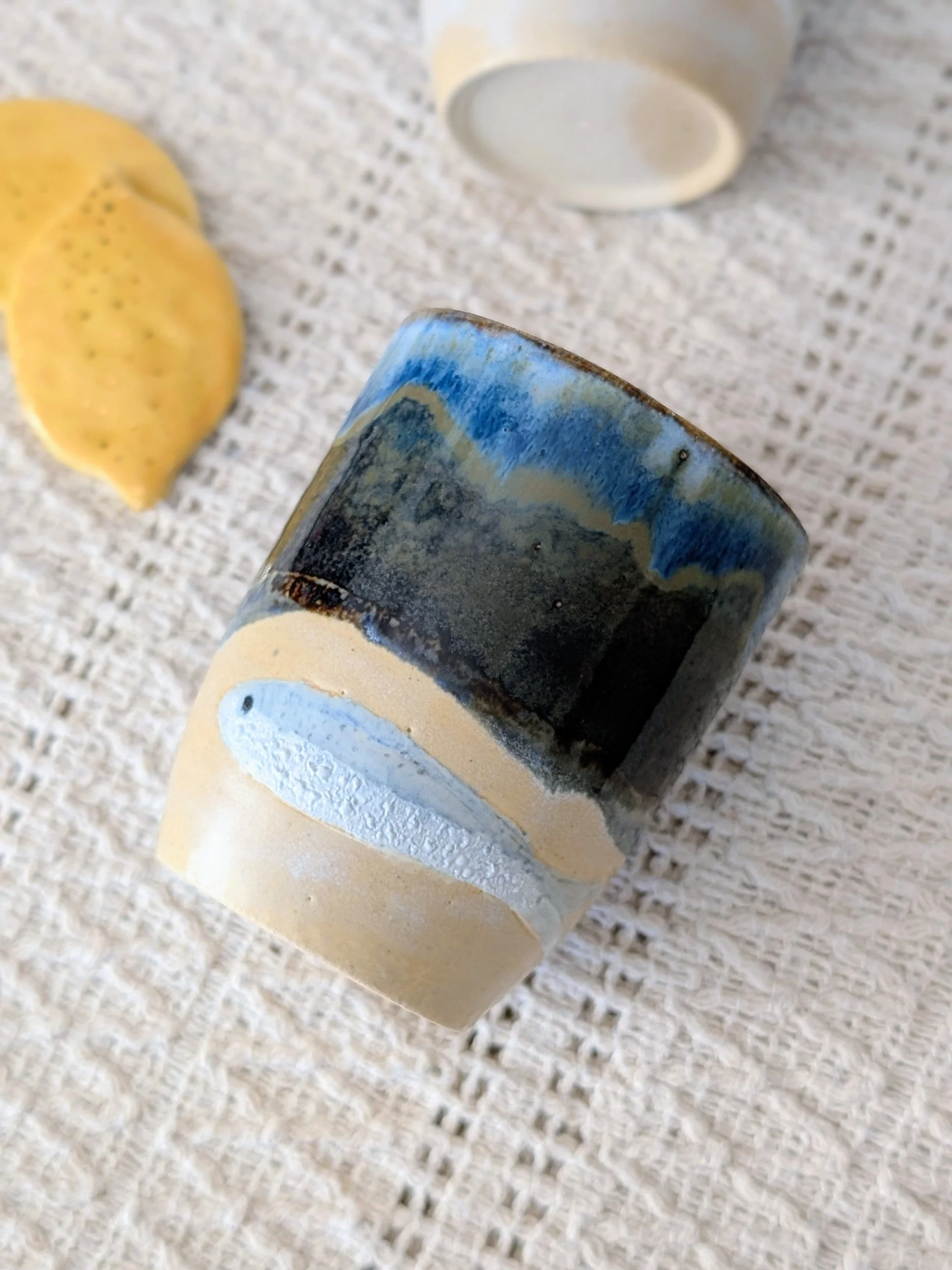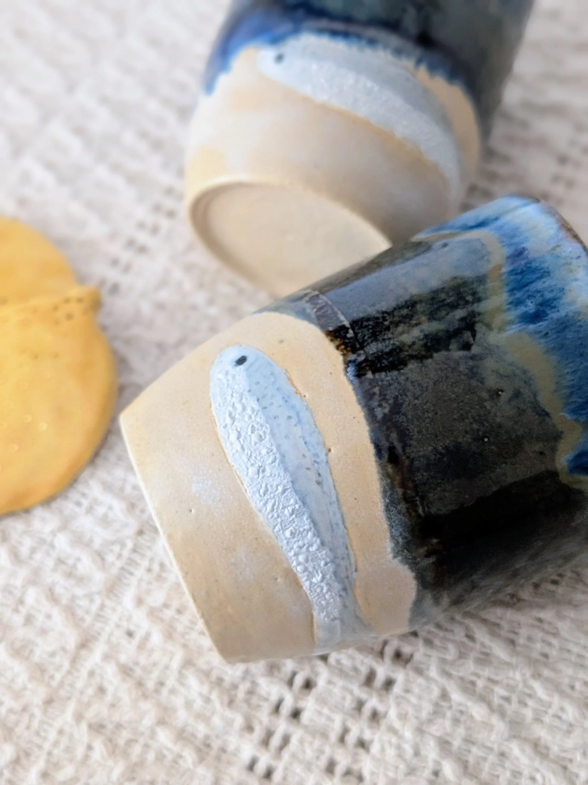 This cup has been carefully hand-glazed with a charming sardine design.