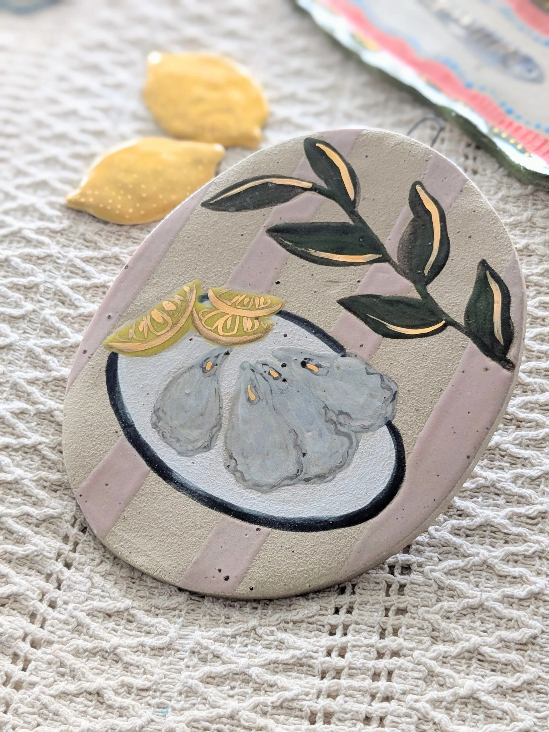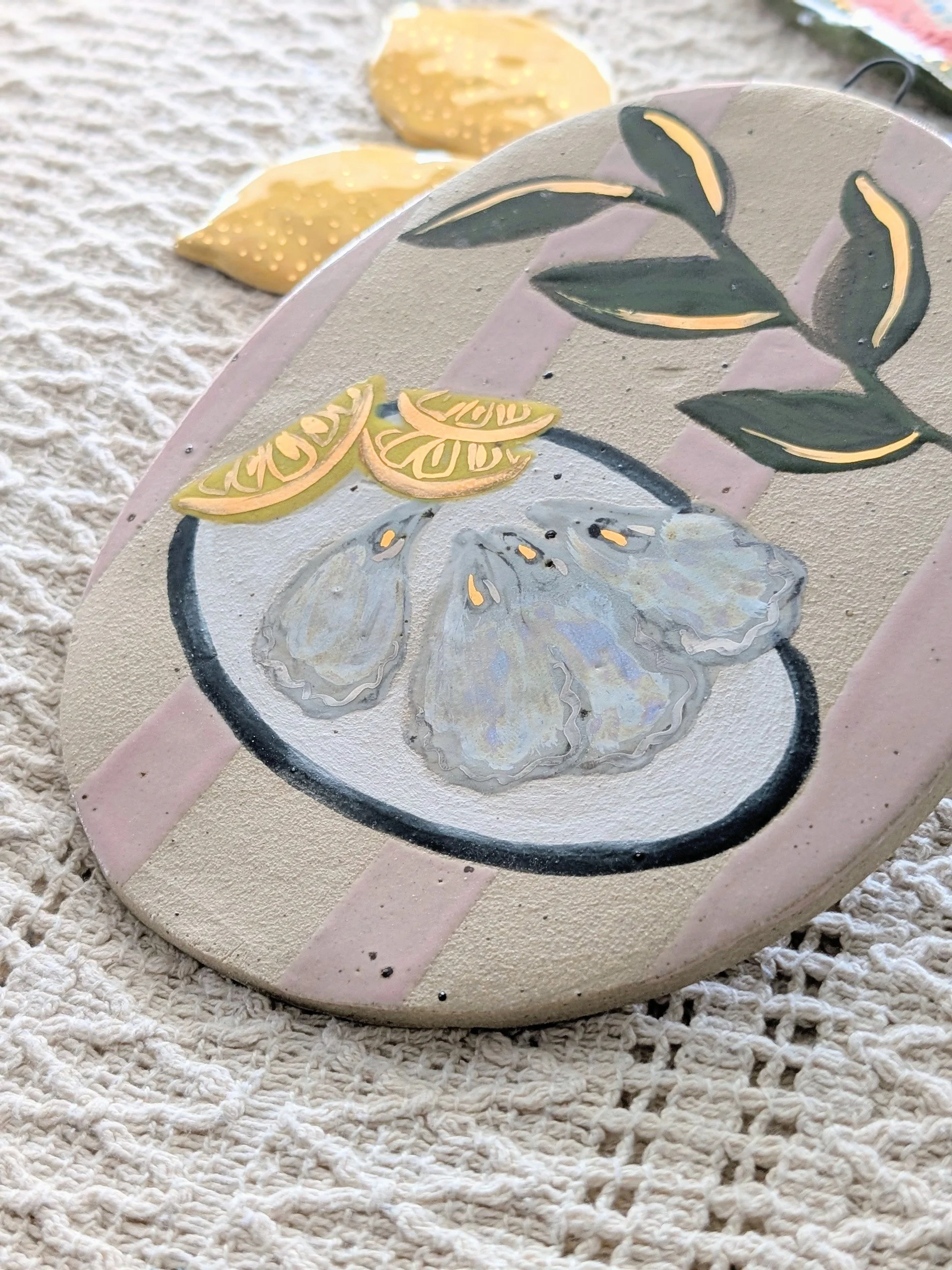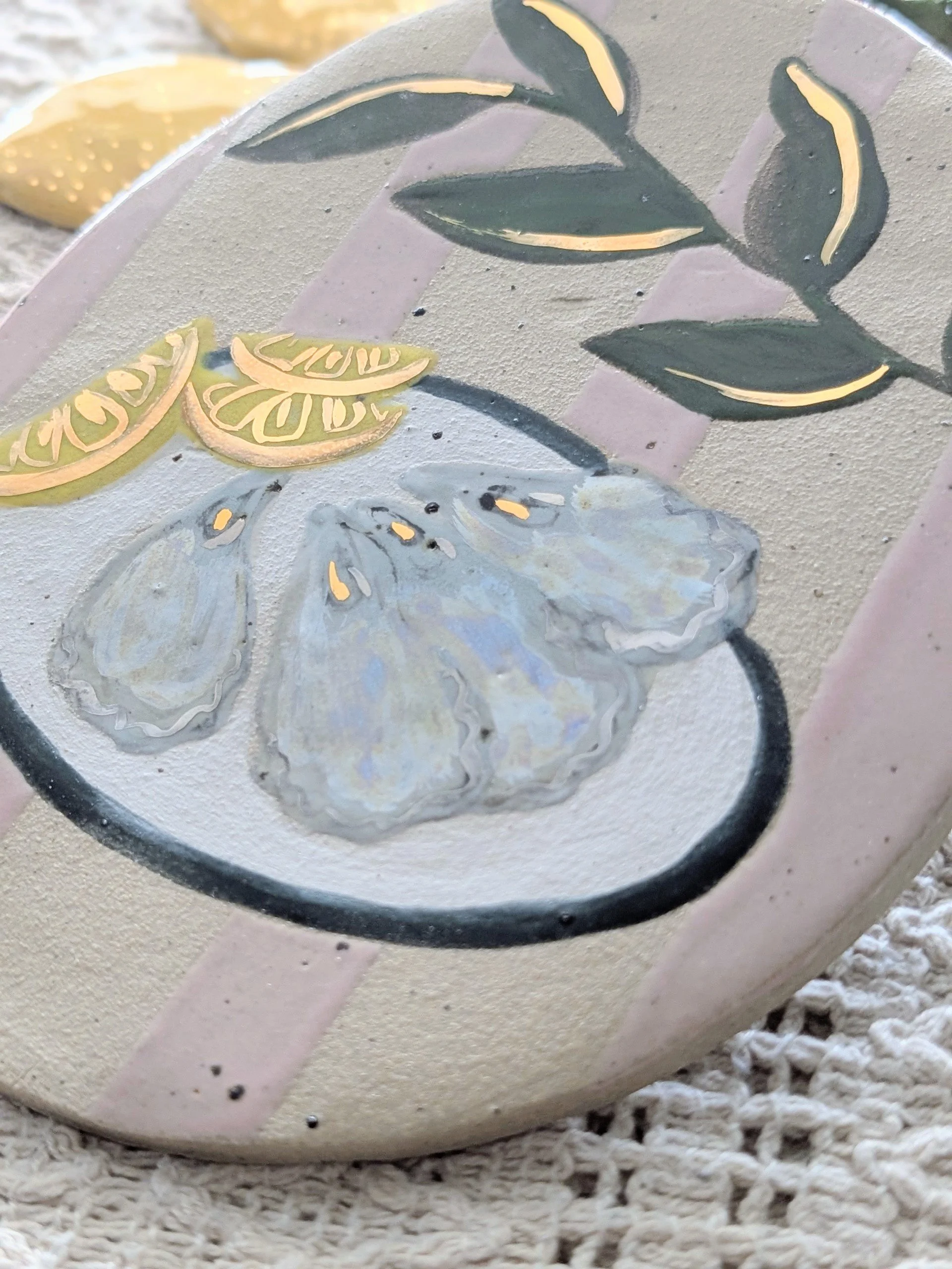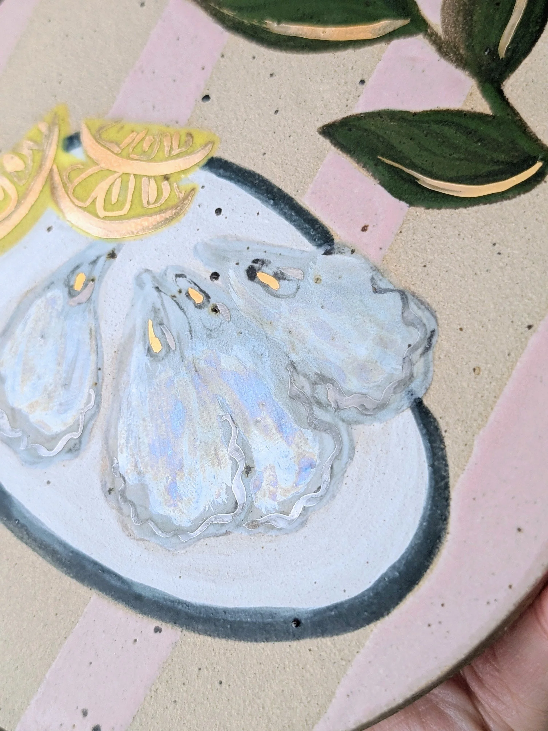 The oysters and lemon ornament features delicate 22ct gold lustre highlights, catching the light beautifully and adding a subtle touch of sparkle they are finished with mother of pearl lustre.