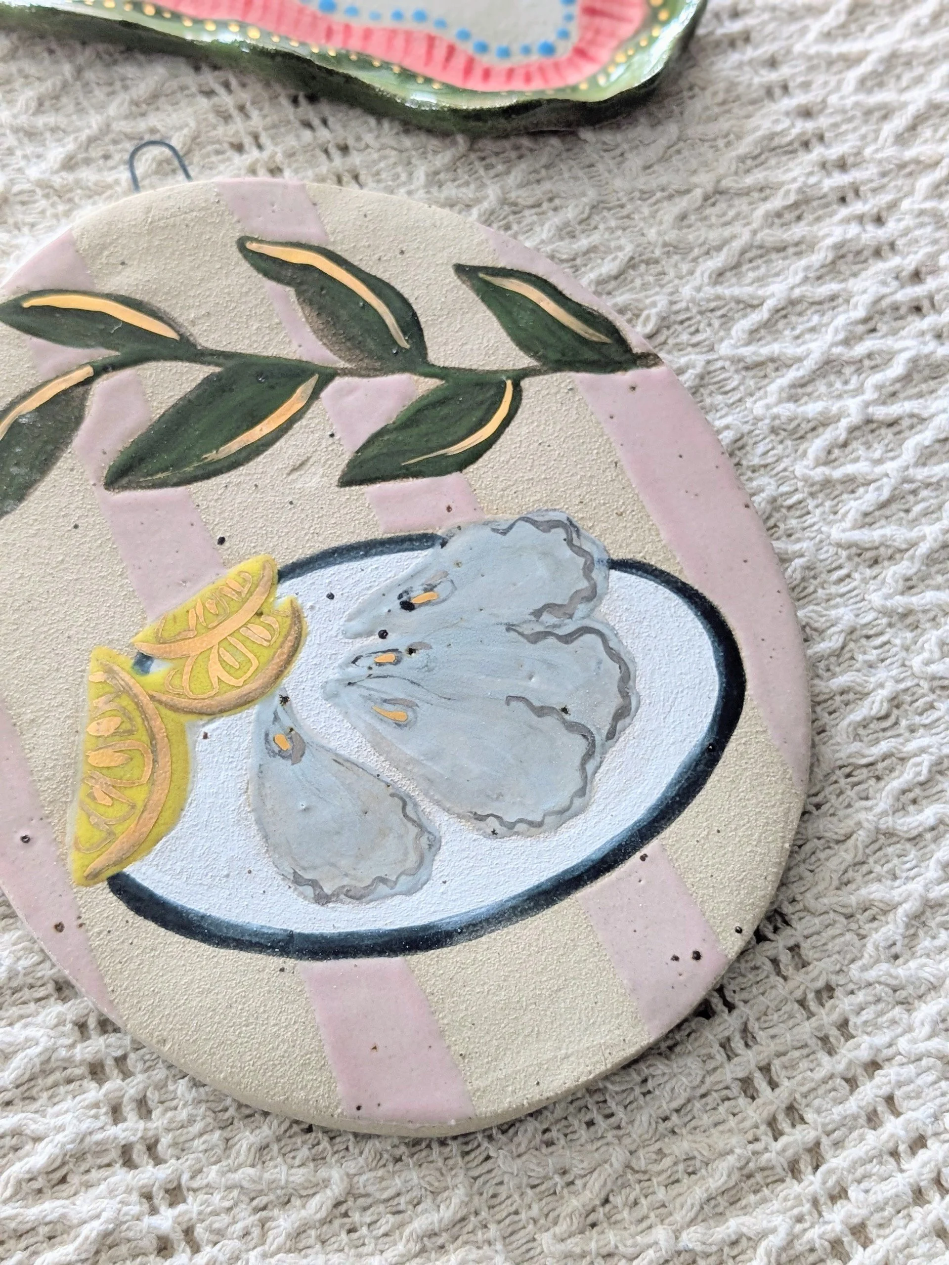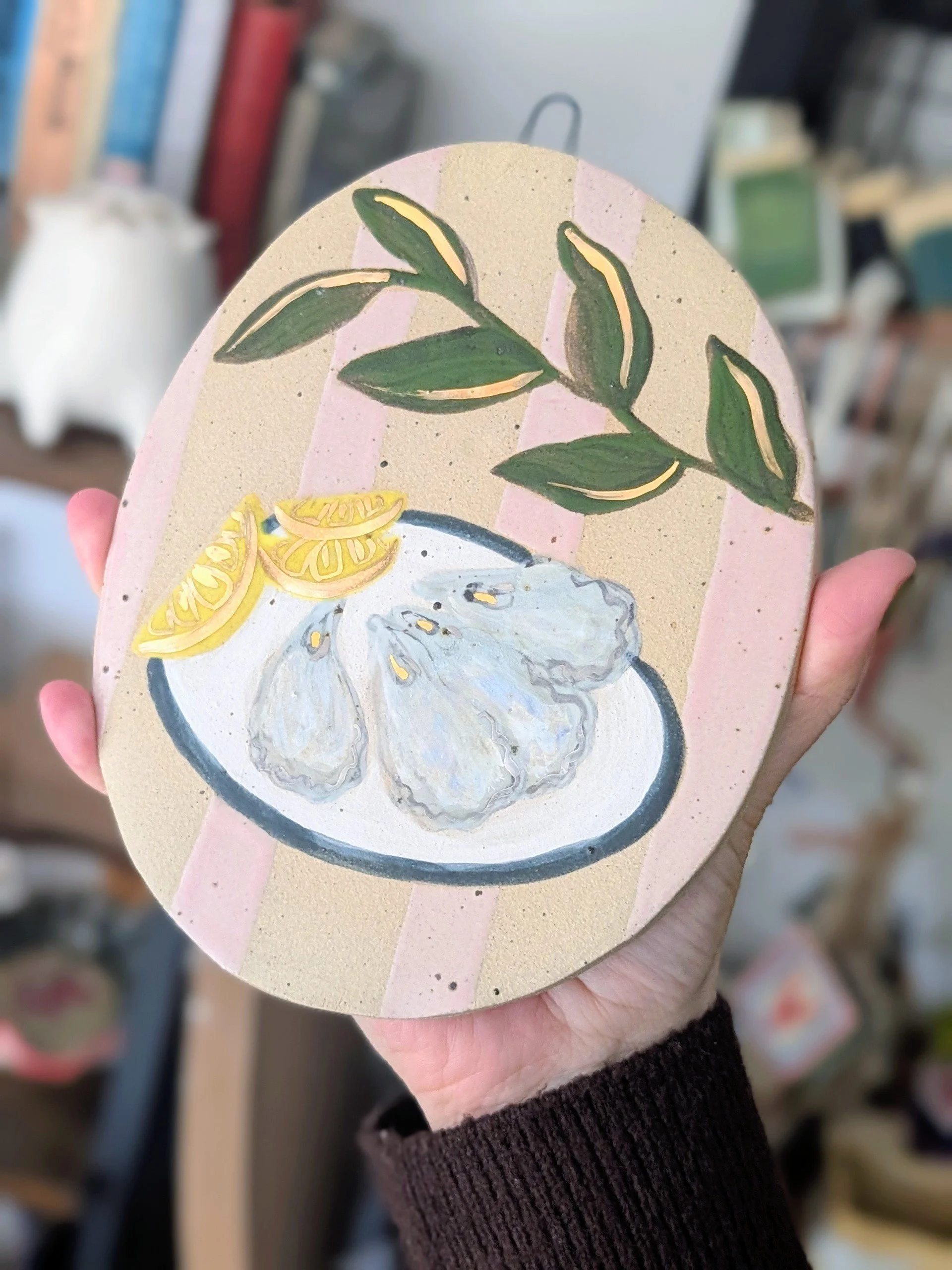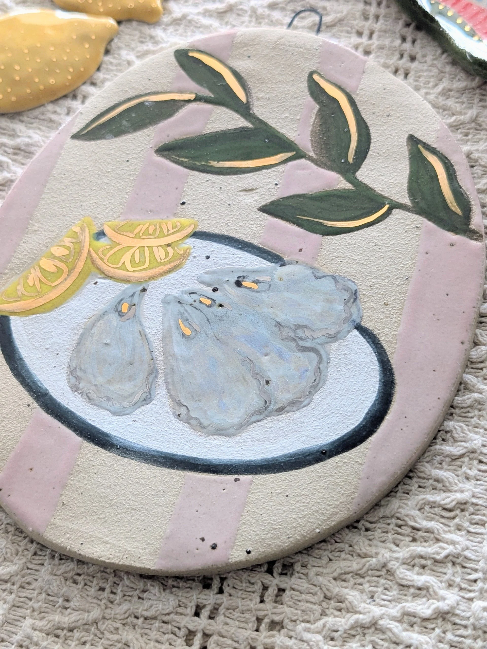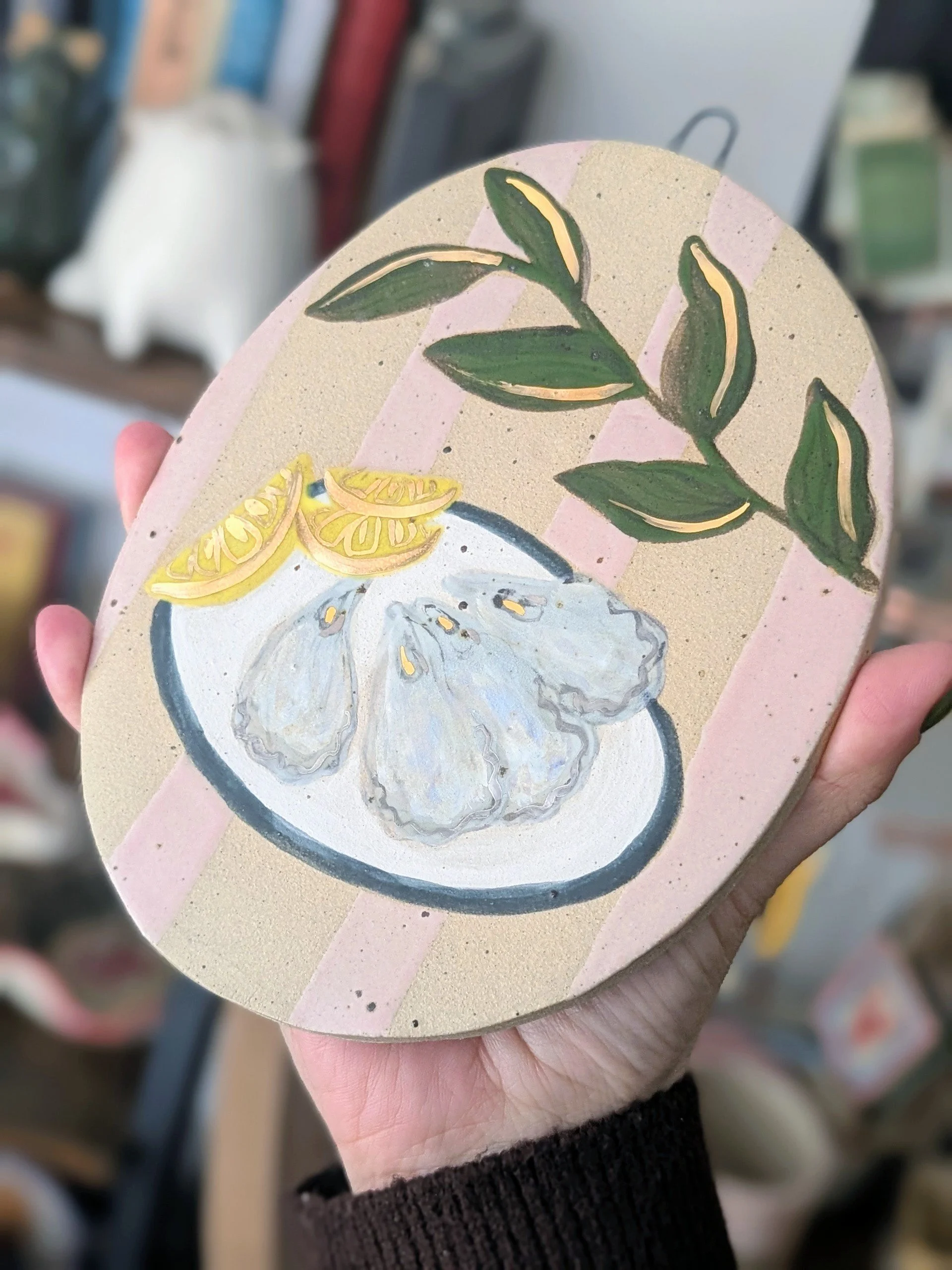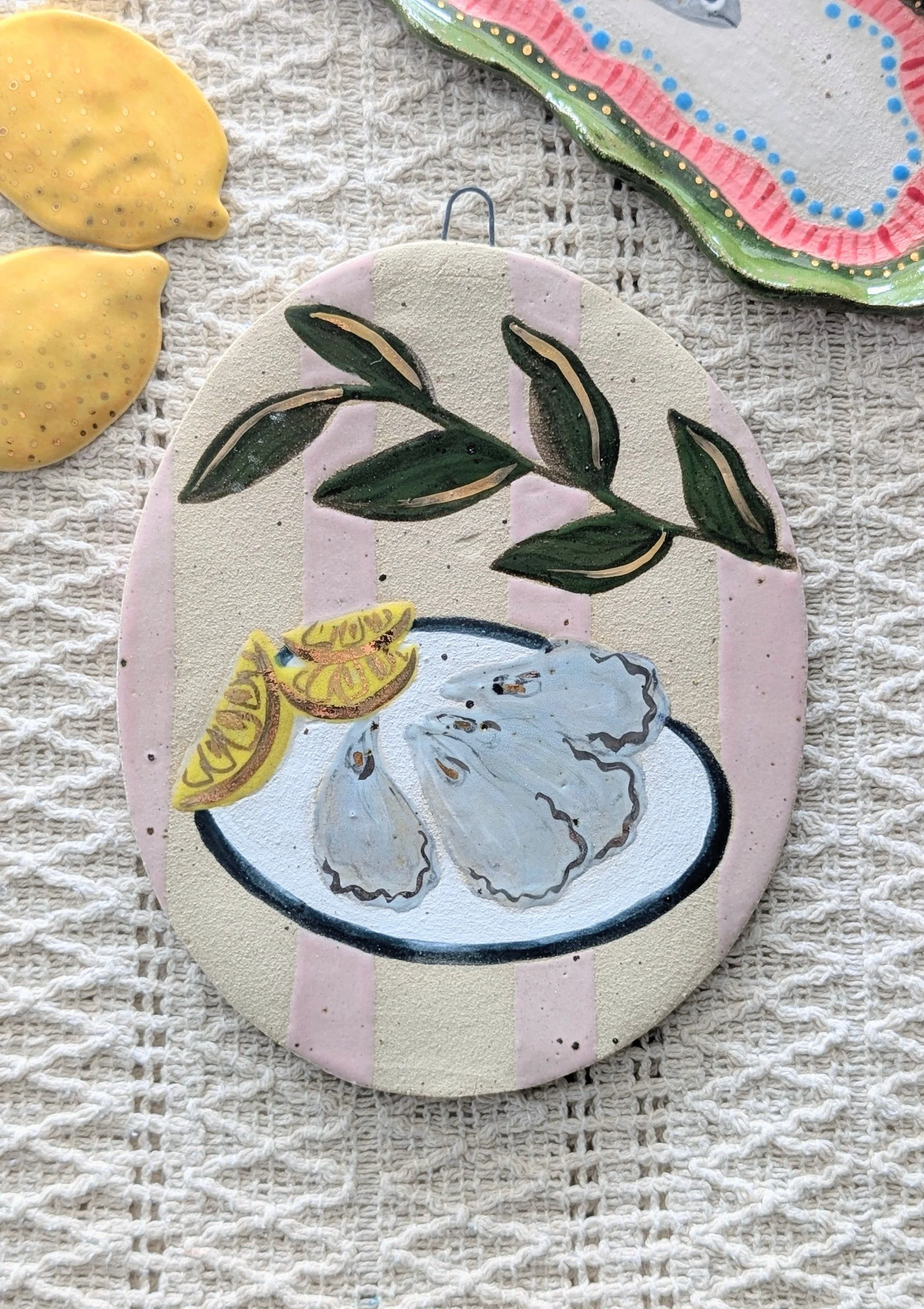 The oysters and lemon ornament features delicate 22ct gold lustre highlights, catching the light beautifully and adding a subtle touch of sparkle they are finished with mother of pearl lustre.